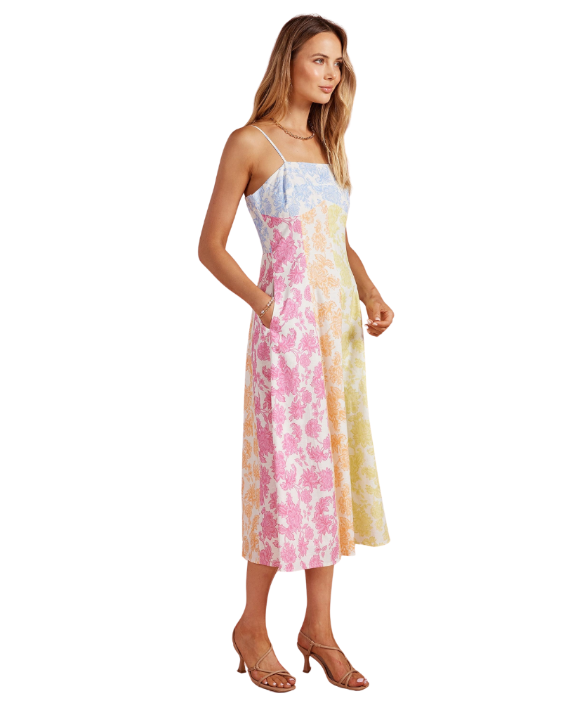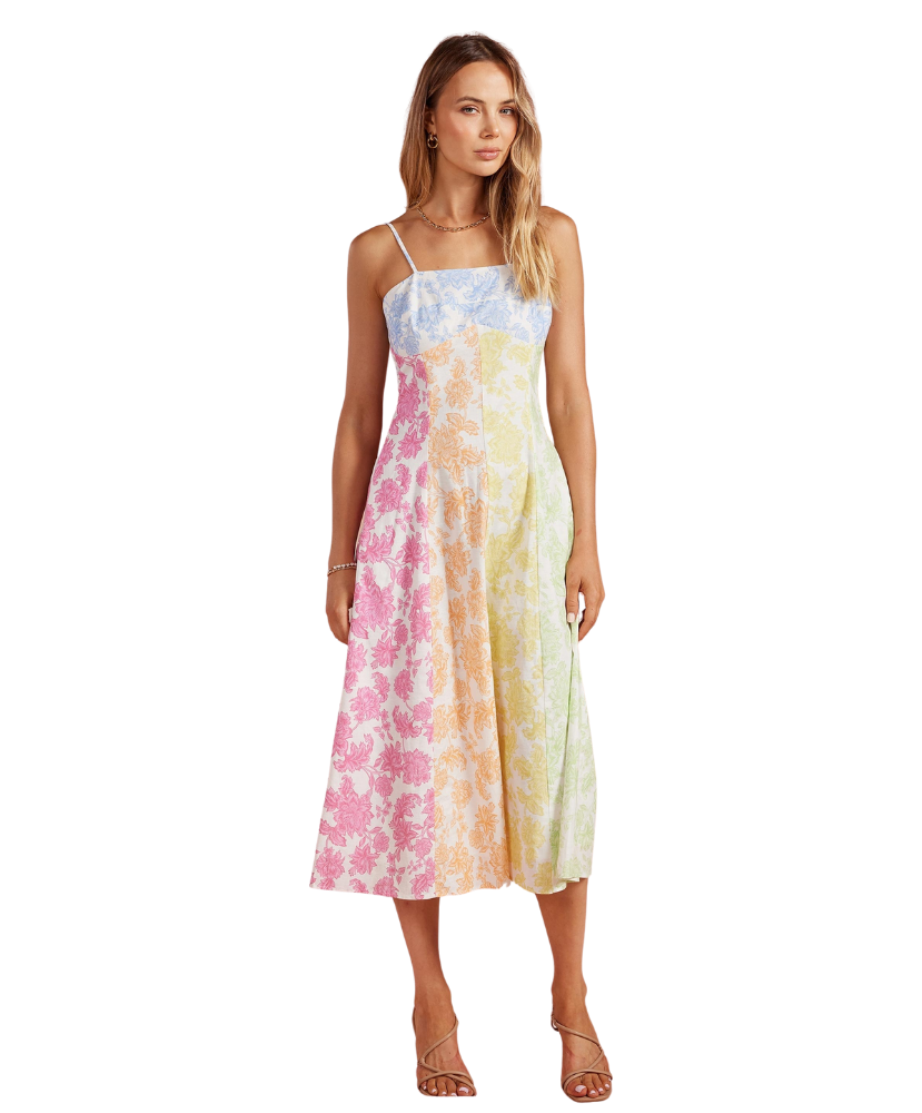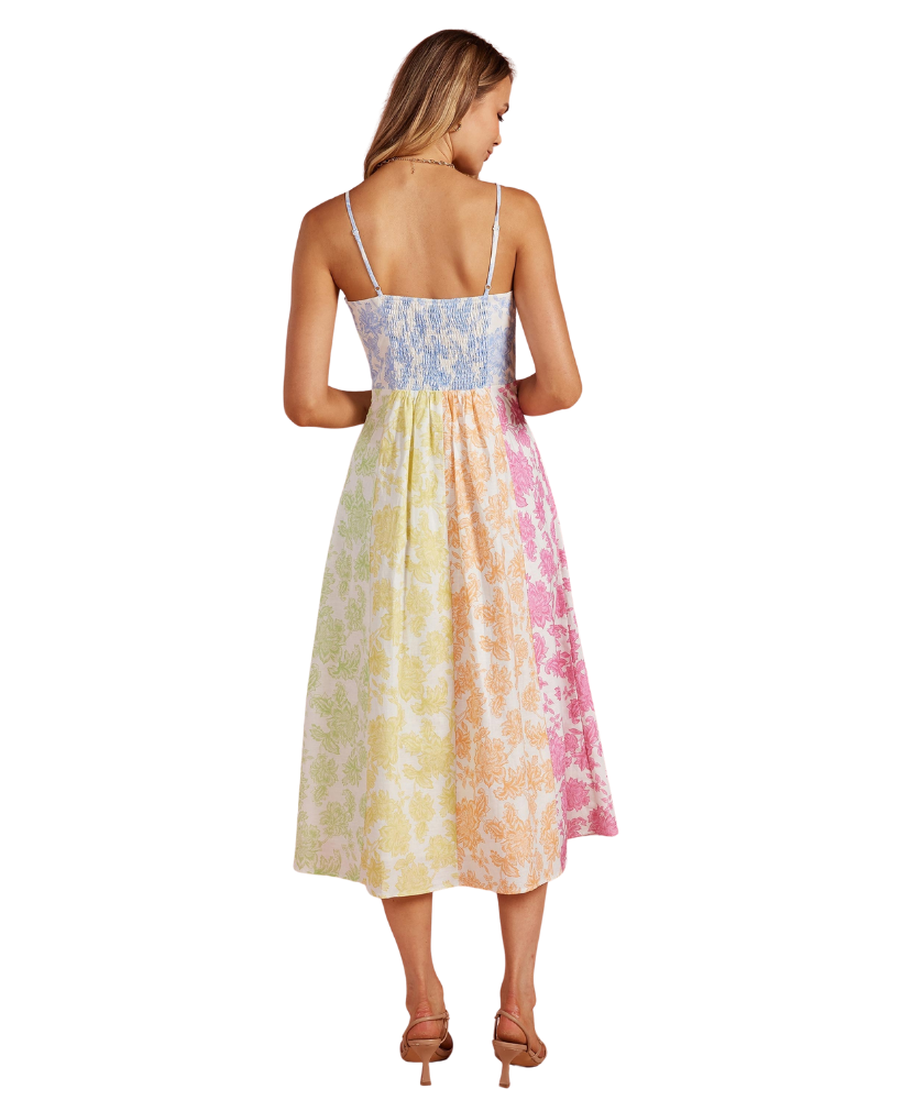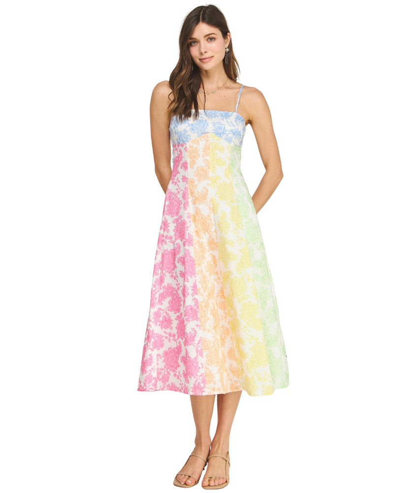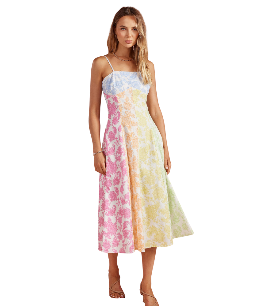 Fresh, feminine, and full of charm—this dress feels like a stroll through a blooming garden. The soft patchwork of pastel florals gives it a playful yet polished look, while the flattering fit makes it an easy favorite for everything from brunch to weddings.