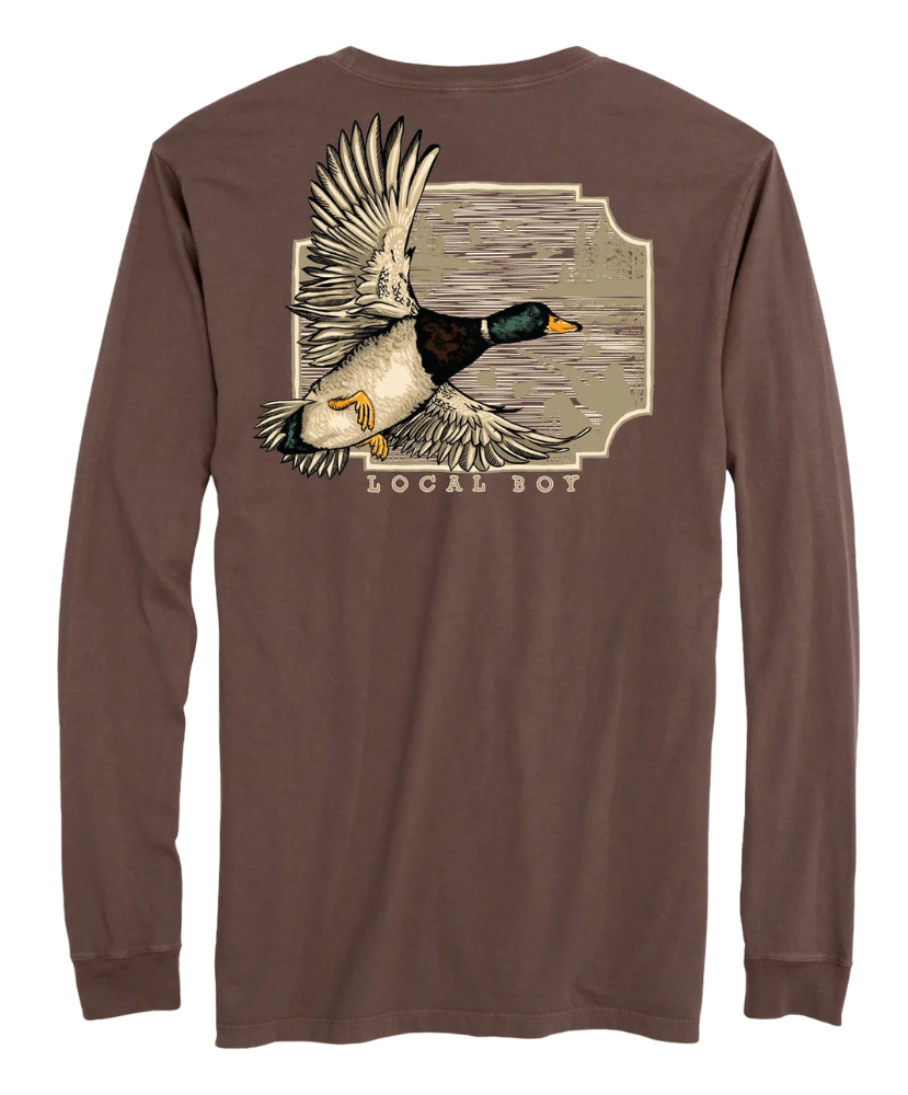 This tee takes flight just like the mallard on the back—bold, classic, and hard to miss. Built from soft preshrunk cotton with a traditional fit, it’s made for cool mornings in the blind or casual nights in town. Pocket up front with our signature dog & moon logo, statement graphic on the back, and all the comfort you expect from your go-to Local Boy long sleeve.