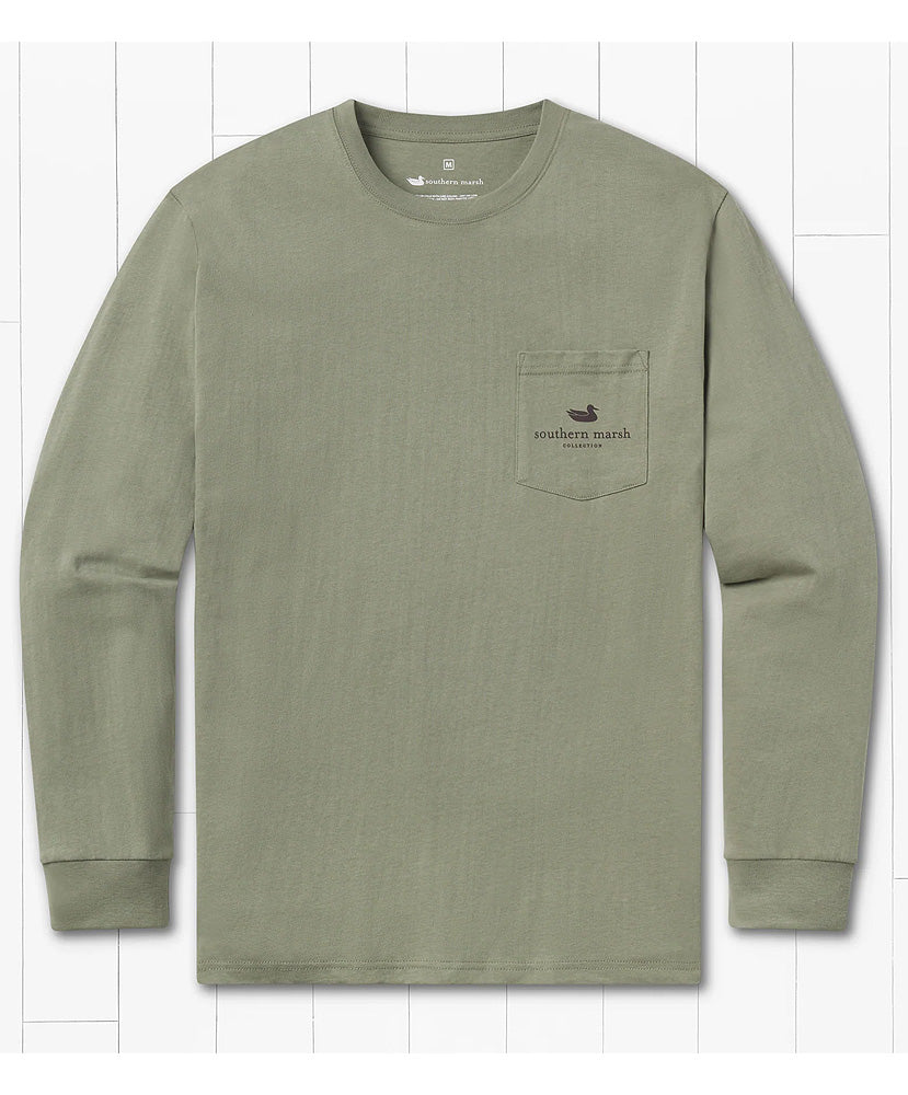 On those crisp fall mornings, the long sleeve Birdshot tee is a great layering piece boasting soft cotton fabric and a printed neck tag for added comfort. Great for the hunter or general outdoorsman, this timeless southern tee highlights one of the biggest past times in the region – hunting waterfowl.