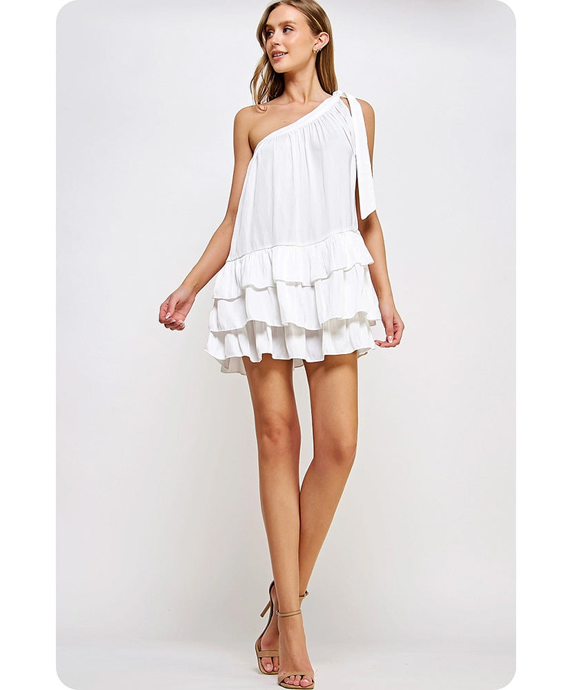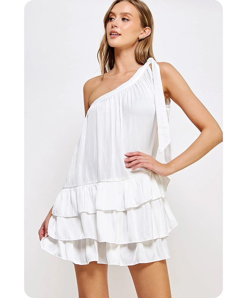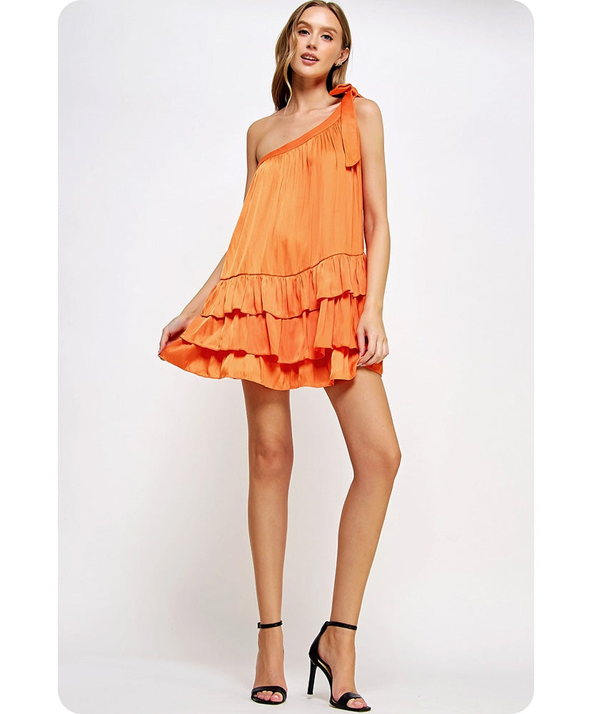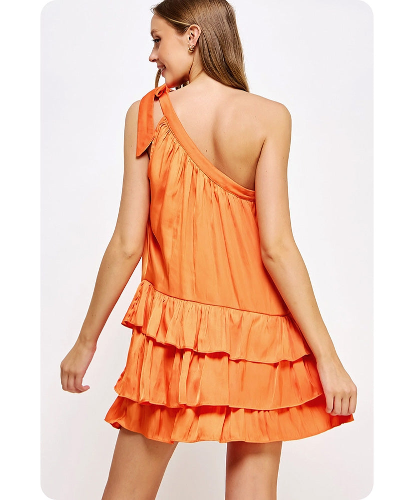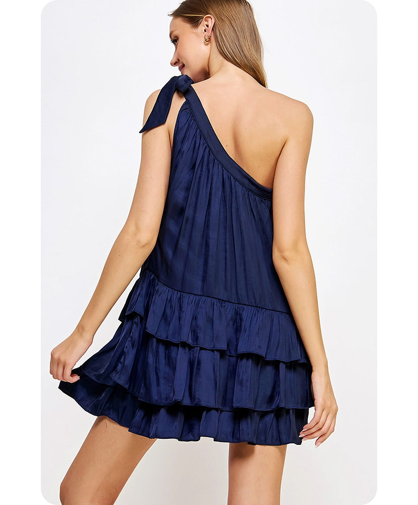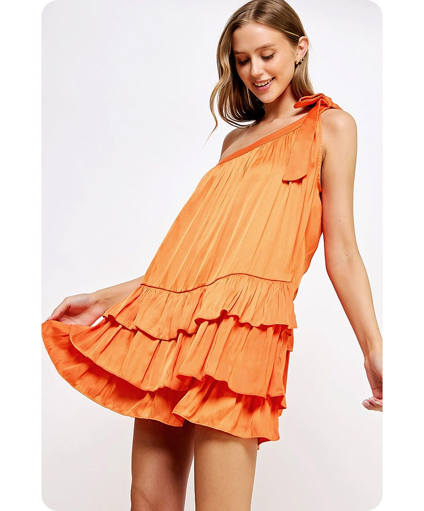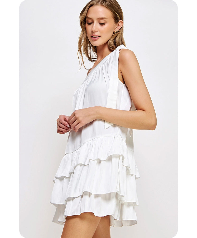This is a one-shoulder ruffled mini dress in satin fabric. It is sleeveless and features a one-shoulder construction with an adjustable bow tie detail, a tiered and ruffled mini skirt, and a loose fit.