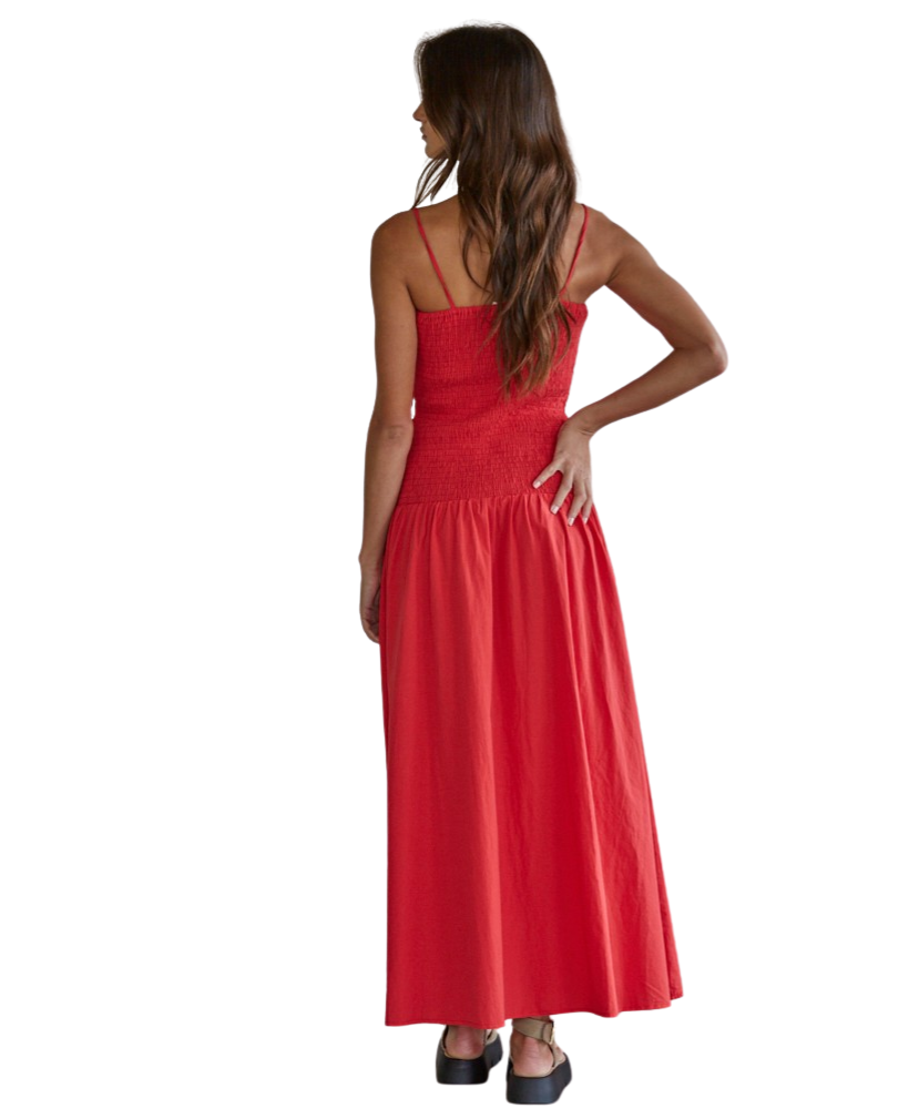 Turn heads in the bold and beautiful Rouge Smocked Dress. This vibrant midi is the perfect blend of effortless and flattering, featuring a stretchy smocked bodice that hugs in all the right places and a breezy skirt that moves with you. Whether you're heading to brunch, vacation dinners, or summer events, this dress brings easy confidence and timeless charm.