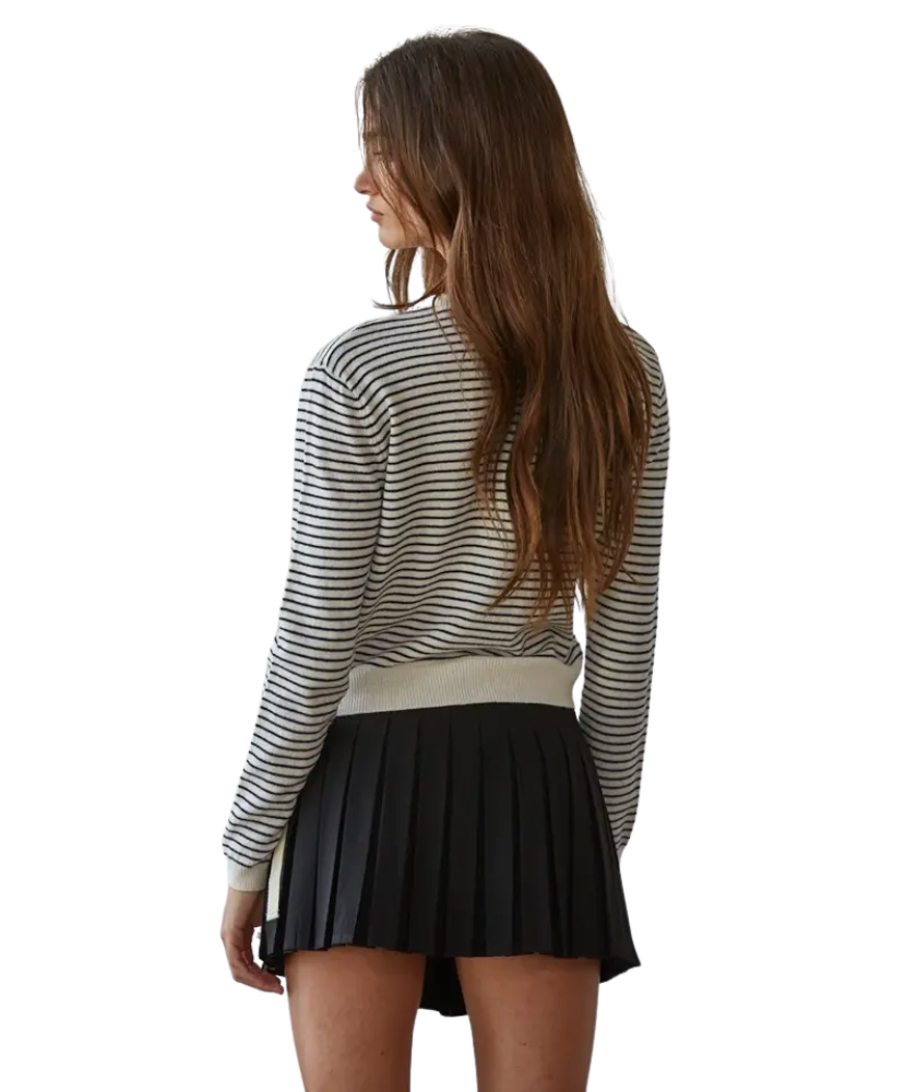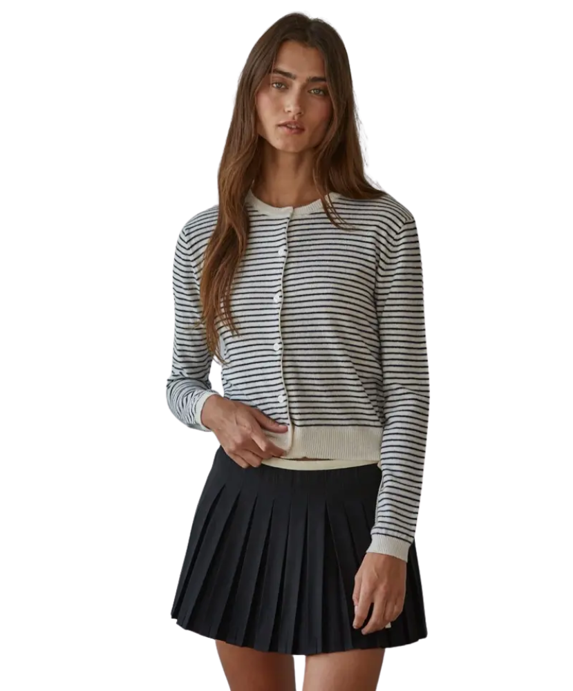 Your fall layering game just leveled up. The Jackie Striped Cardigan is a timeless crew neck knit that’s equal parts chic and comfortable. With its black-and-cream stripes and soft, lightweight feel, it’s perfect for tossing over tees on crisp mornings, styling with skirts for a polished look, or pairing with jeans for an easy weekend vibe.