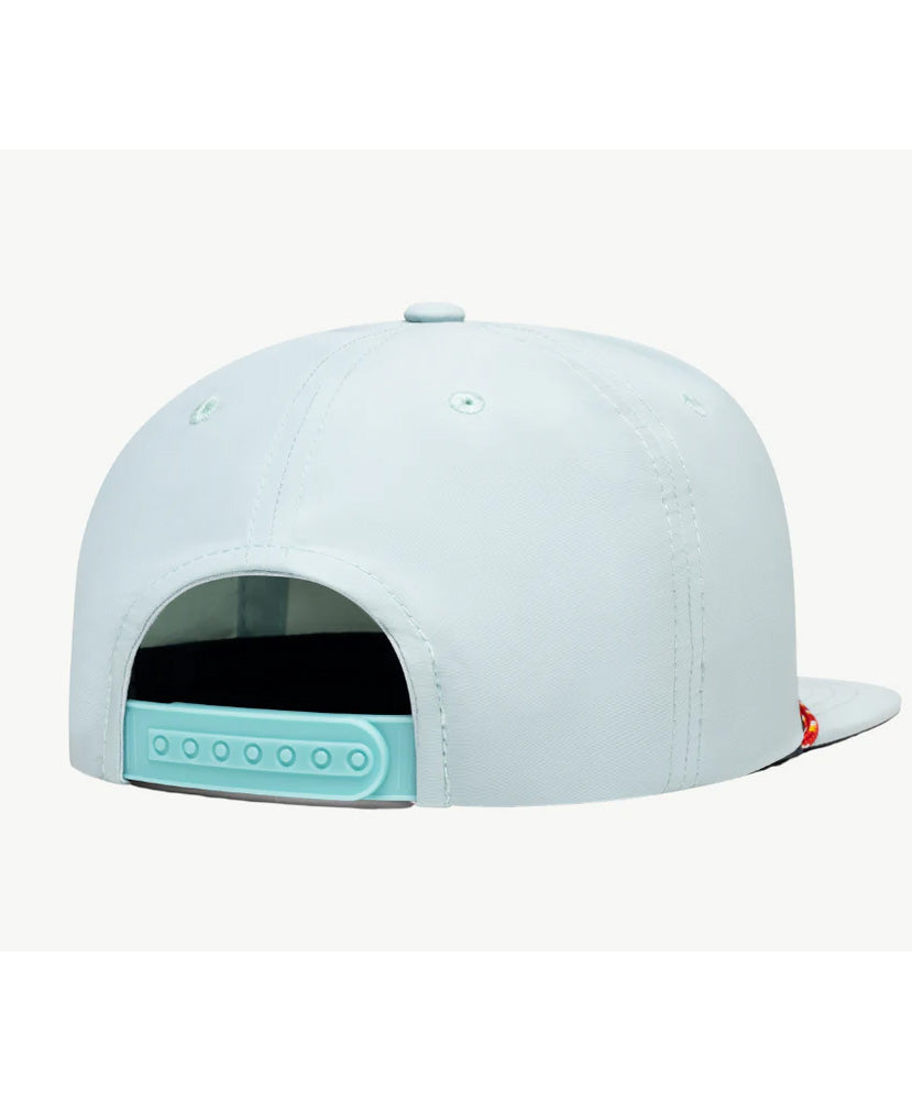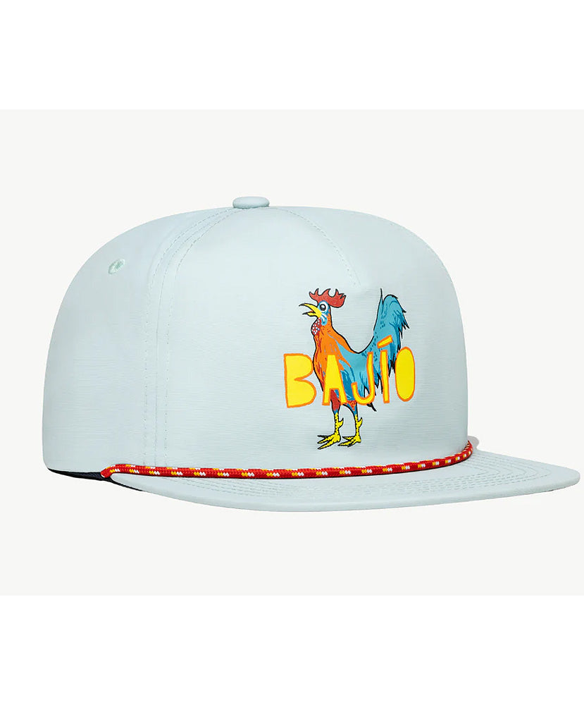 This hat offers a snapback closure, a 100% recycled plastic bill structure with navy underbrim to reduce glare, and artwork featuring the town of Xcalak’s unofficial mascot—El Gallo—named for a charismatic local storyteller nicknamed Gallo (Spanish for rooster) because of his red hair.