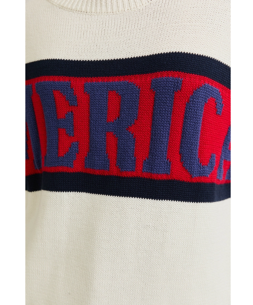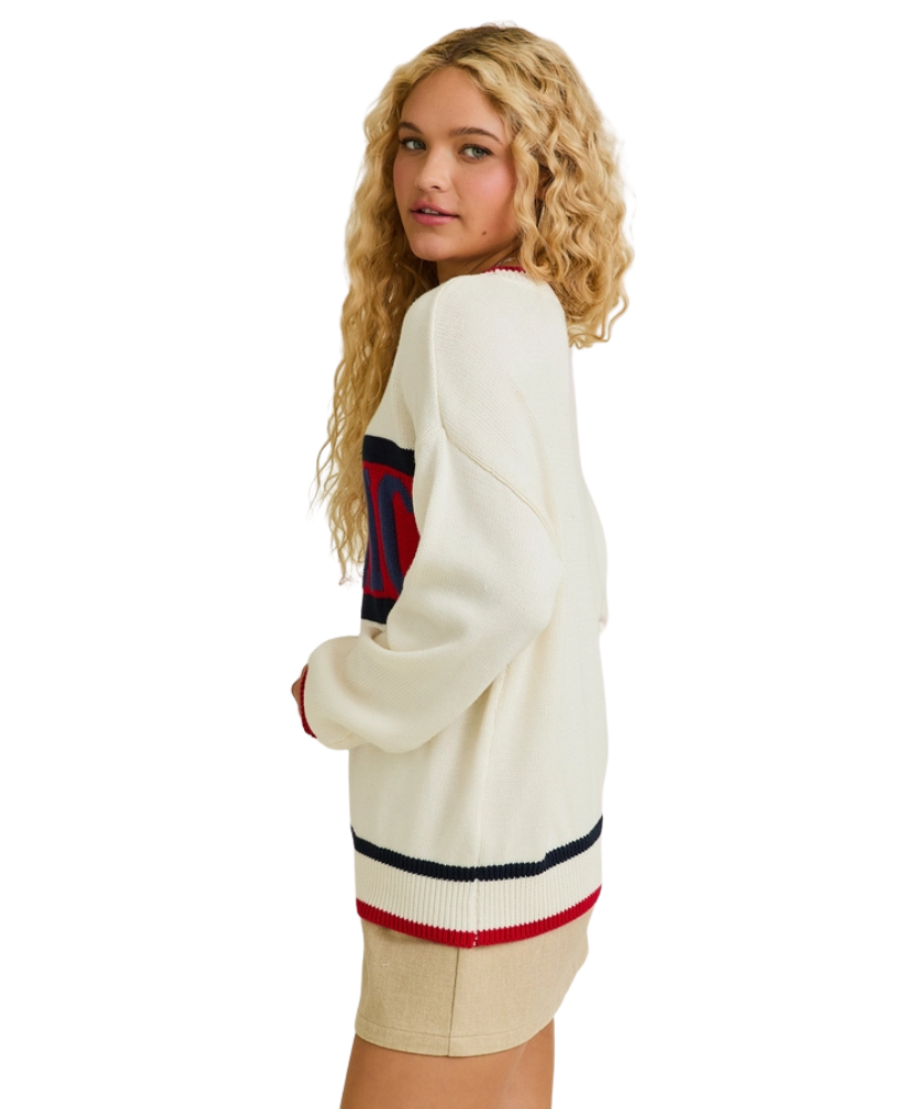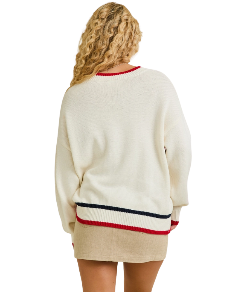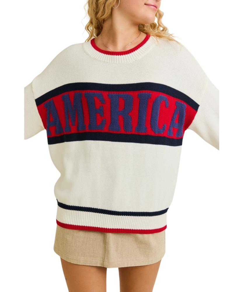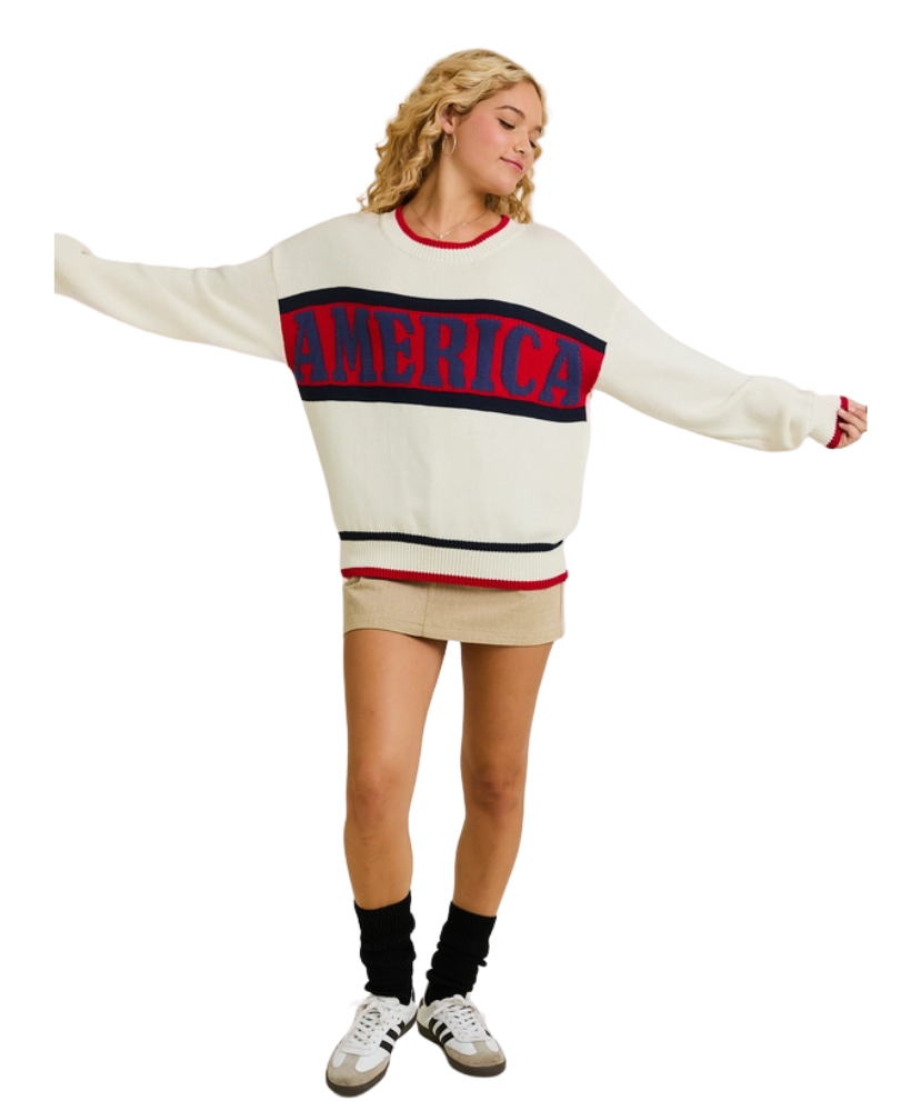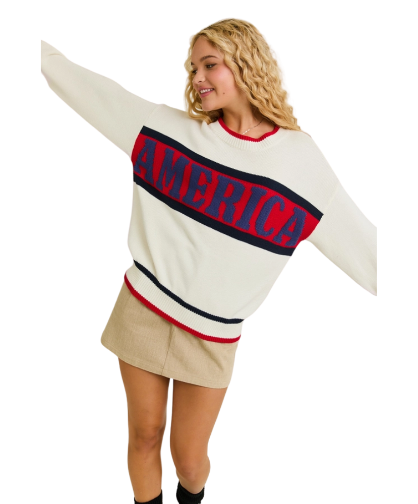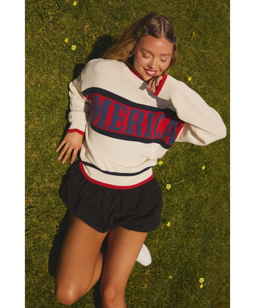 Land of the free, home of the cozy. This red, white, and navy knit sweater says “AMERICA” loud and proud across the front so you don’t have to. With varsity-style stripes and a slouchy, oversized fit, it’s perfect for backyard BBQs, rooftop fireworks, or just flexing your patriotism from the couch.