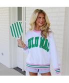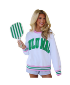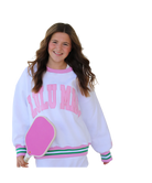 The Society Stitch Sweatshirt blends classic collegiate vibes with a fresh, feminine twist. Featuring bold stitched lettering, contrast ribbed trim, and a perfectly relaxed fit, this sweatshirt is made for everything from pickleball breaks to coffee runs. Soft, comfy, and cute enough to wear on repeat.