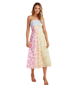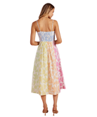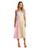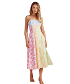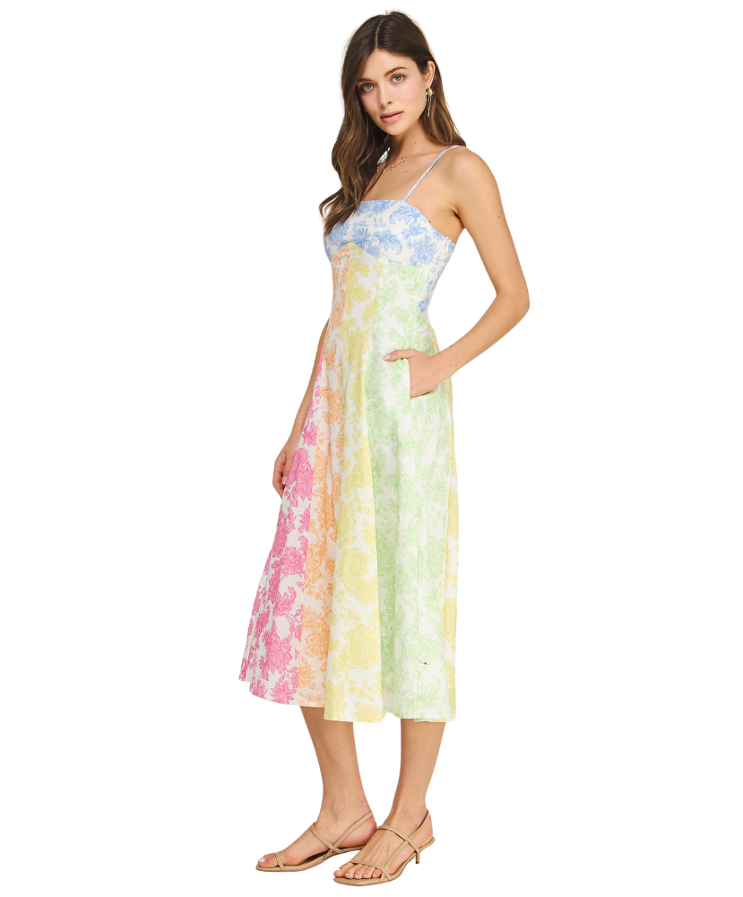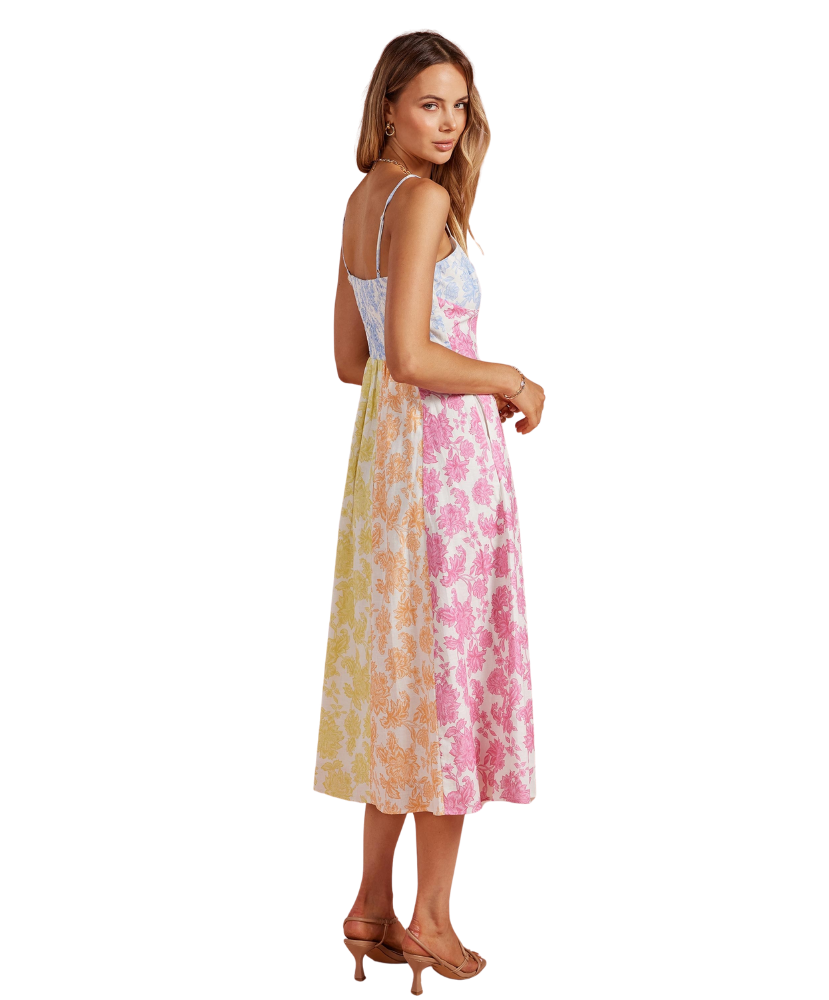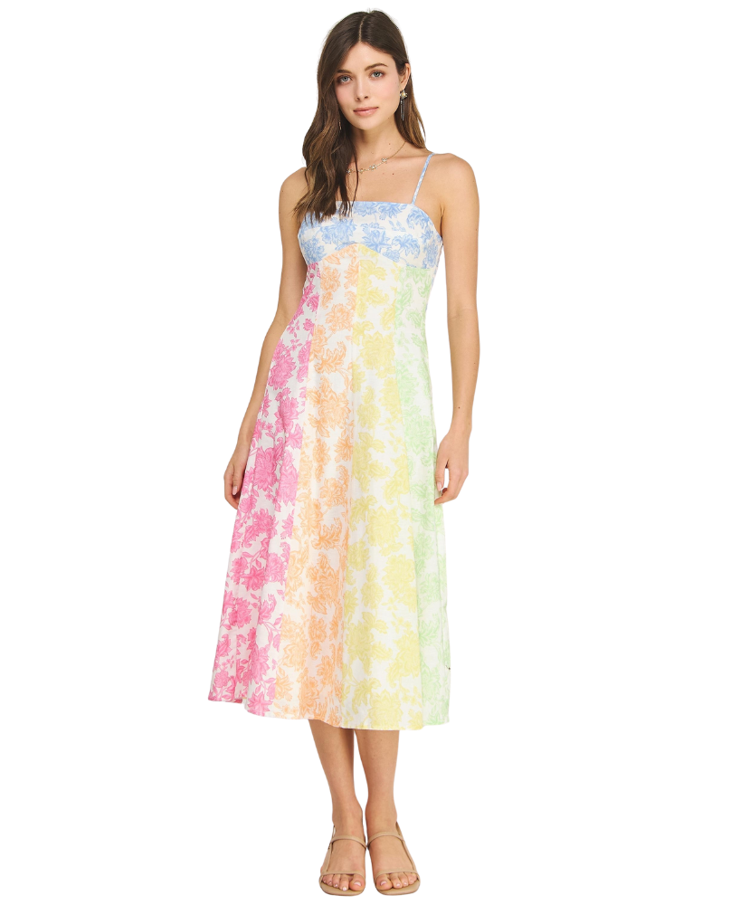 Fresh, feminine, and full of charm—this dress feels like a stroll through a blooming garden. The soft patchwork of pastel florals gives it a playful yet polished look, while the flattering fit makes it an easy favorite for everything from brunch to weddings.