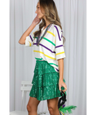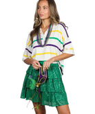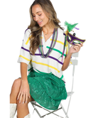 The Multi Stripe Short Sleeve Mardi Gras Shirt is your go-to for laid-back celebration style. Featuring classic purple, gold, and green stripes in a lightweight, high-quality knit, this top brings Mardi Gras spirit in a way that’s easy, elevated, and endlessly wearable. The collared neckline with a flattering V-shape adds a touch of polish, while the relaxed fit and drop shoulders keep it comfortable and cool.