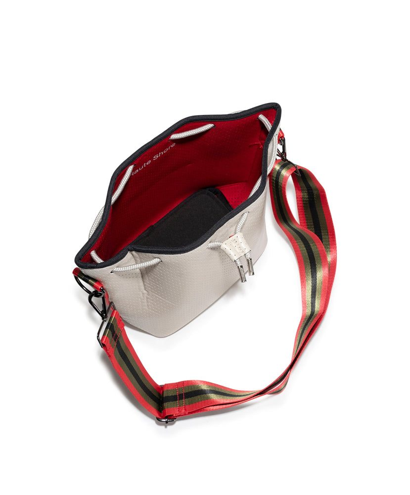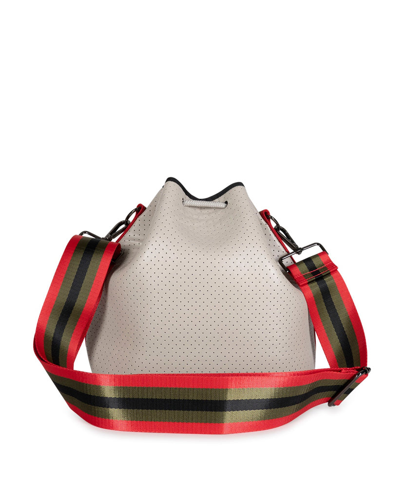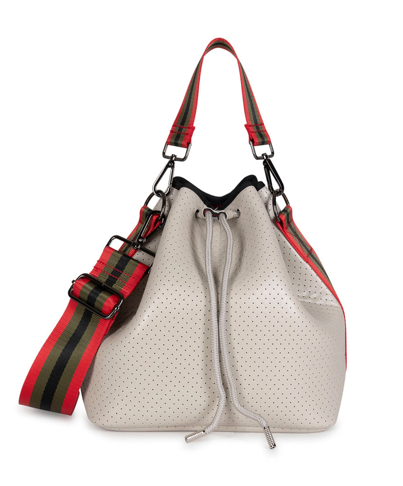 Neoprene bucket bag with side stripe detailing and additional wristlet pouch.