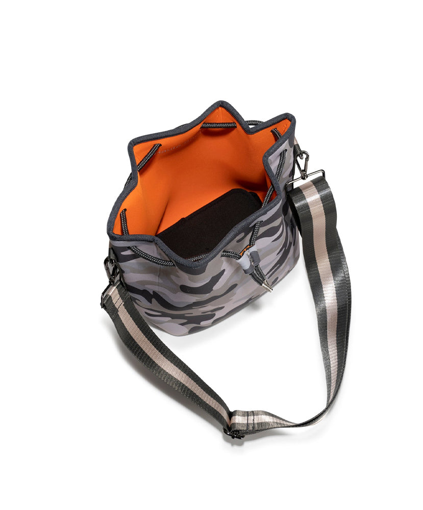 Neoprene bucket bag with side stripe detailing and additional wristlet pouch.