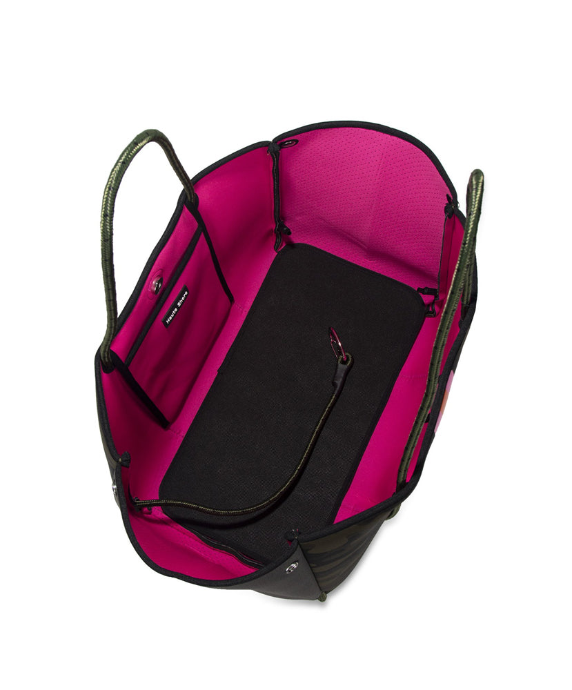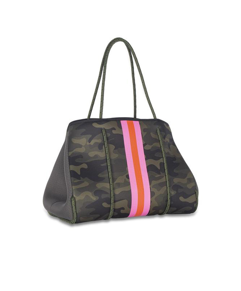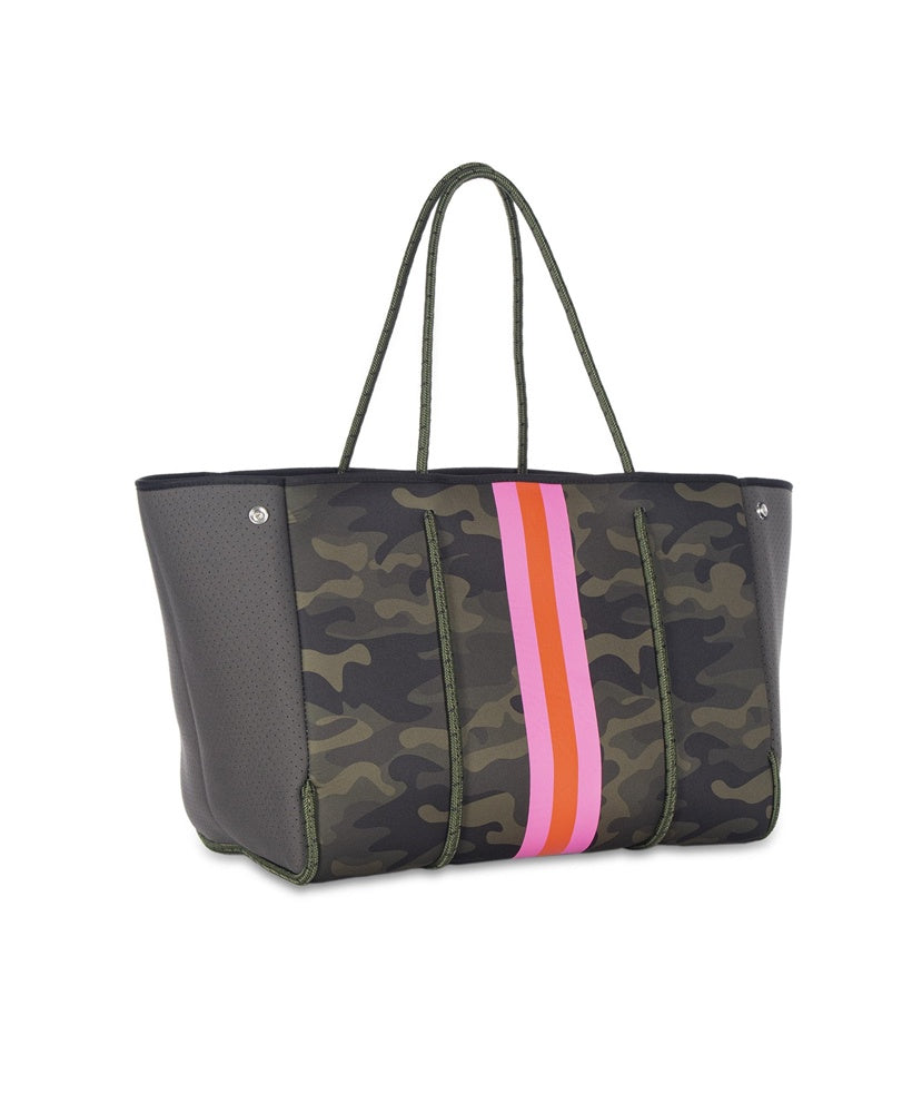 Green Camo/pink and orange stripe. This neoprene tote is the perfect blend of style and functionality.