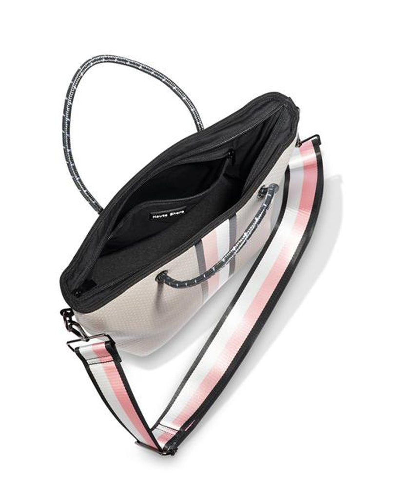 Strap is black blush white stripe - Lined interior with zip pocket and removable wristlet pouch