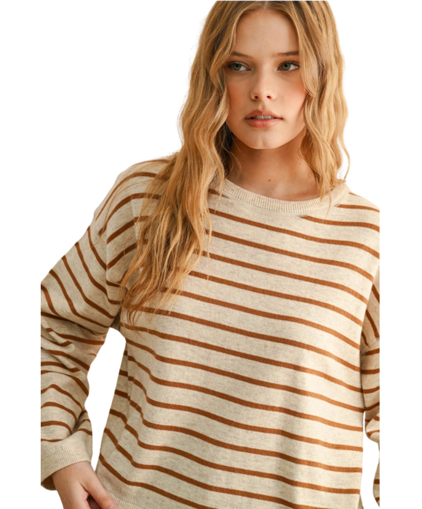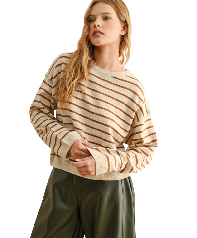 Easygoing, timeless, and effortlessly chic—the Sloane Knitted Top is the kind of piece that makes stripes look sophisticated. With its relaxed fit and soft knit blend, it’s a cozy essential you’ll wear on repeat through fall and winter.