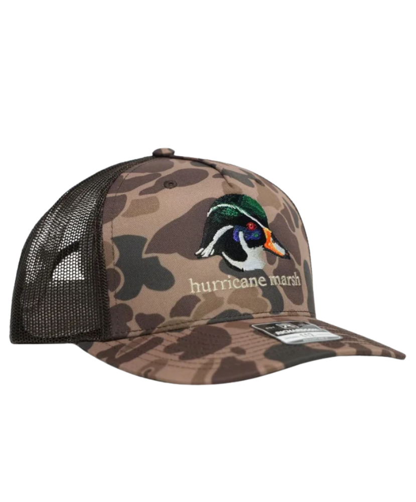 A tribute to one of the most colorful birds in the sky, the Woodie Hat captures the bold beauty of the wood duck with striking embroidered detail. Featuring the iconic Hurricane Marsh logo beneath a full-color wood duck head, this Richardson 112 in Old School Camo with a brown mesh back is a must-have for waterfowlers who appreciate tradition and timeless style.