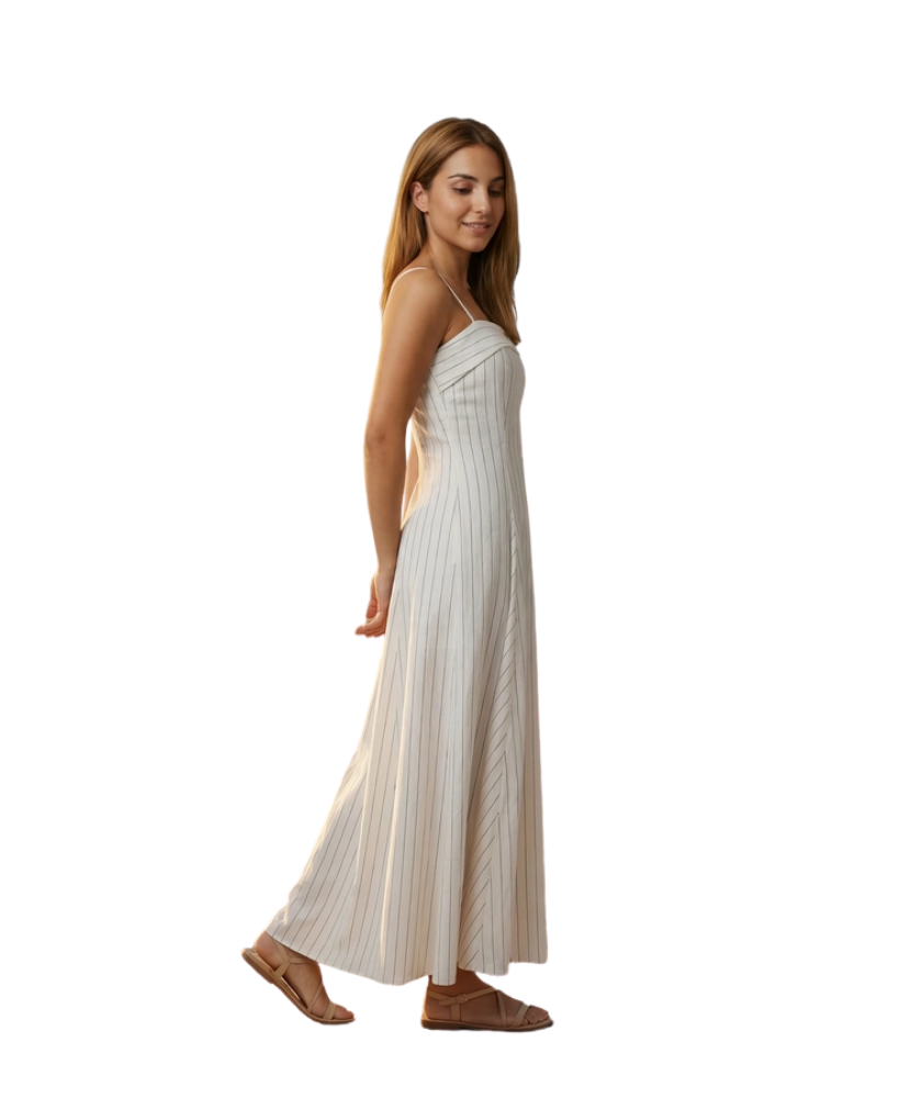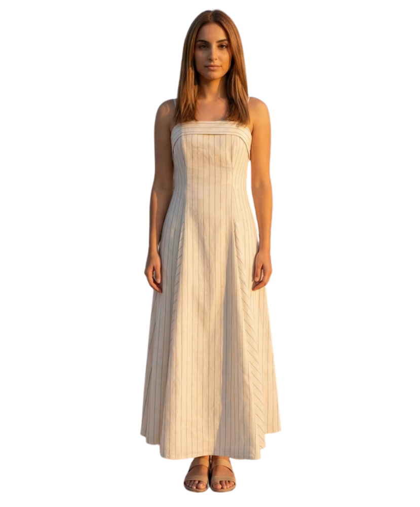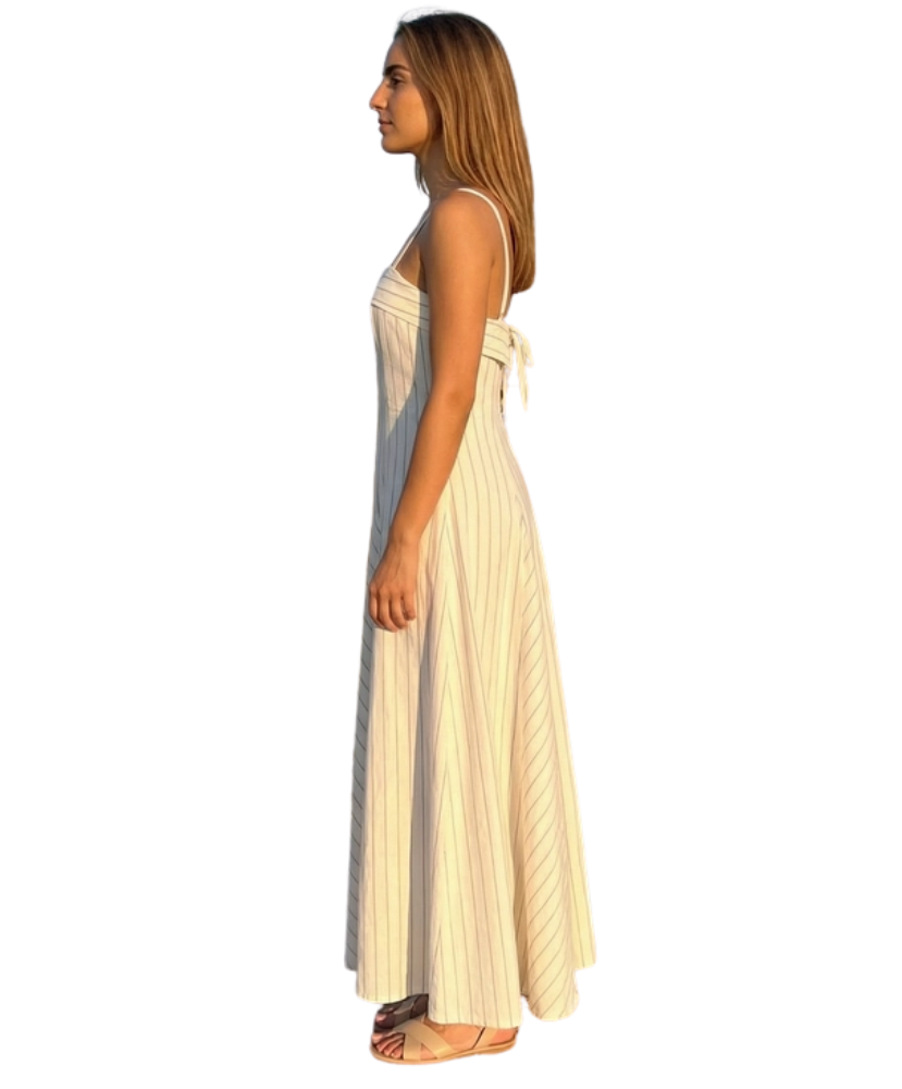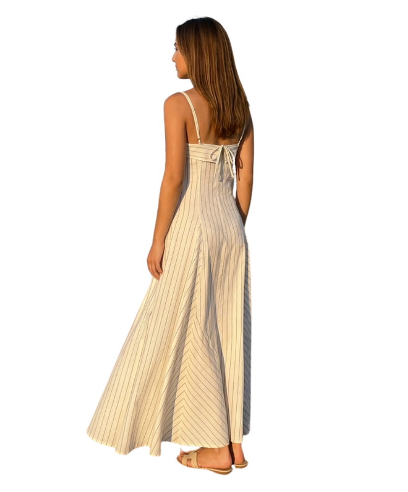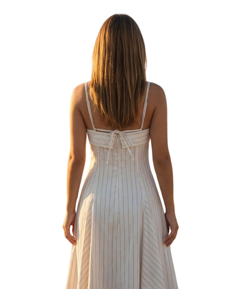 Soft, sweet, and effortlessly elegant, the Summer Stripe Midi Dress is the kind of piece that makes you feel instantly put together. With its flattering corset-style bodice and breezy A-line skirt, this dress blends timeless charm with easy summer style. The subtle pinstripes and delicate back tie detail add just the right amount of polish, making it perfect for brunch dates, garden parties, and sunny strolls.