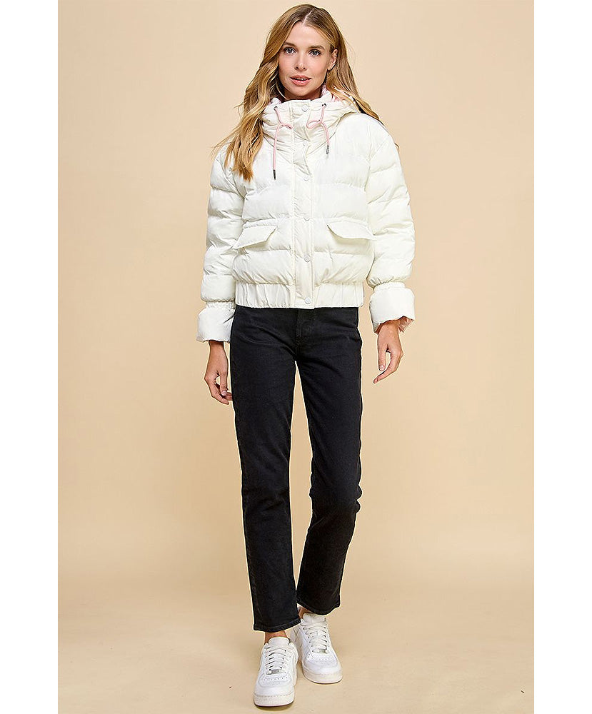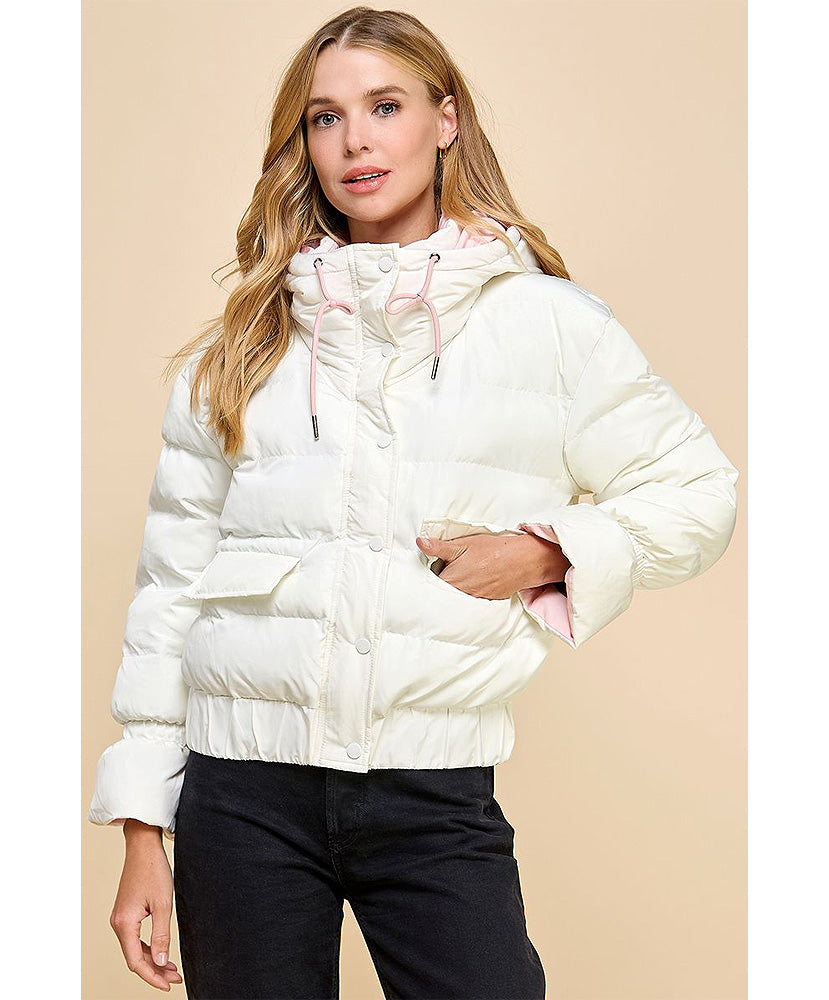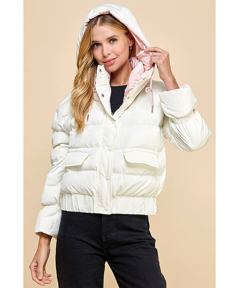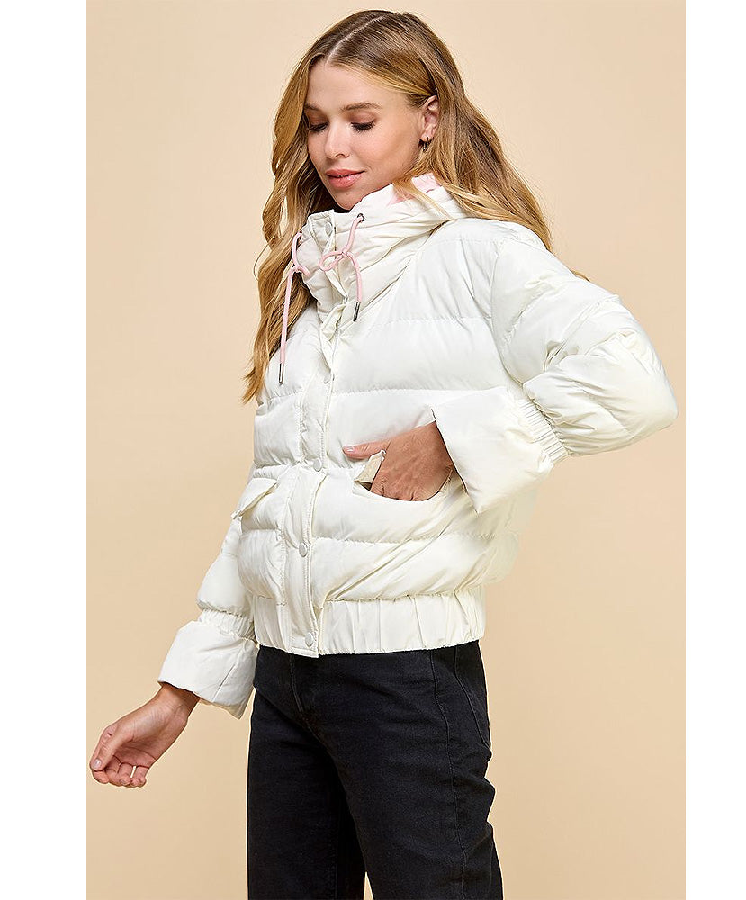 Puffer jacket with zipper front and button closure. With contrast color inside and side pockets.