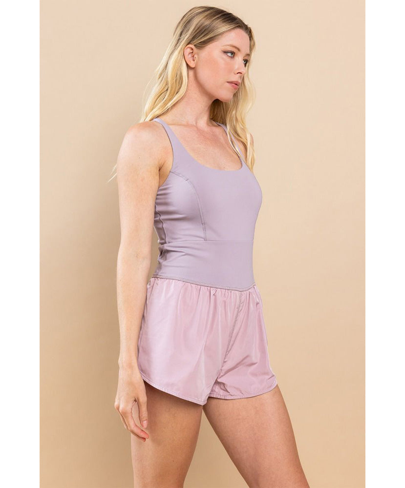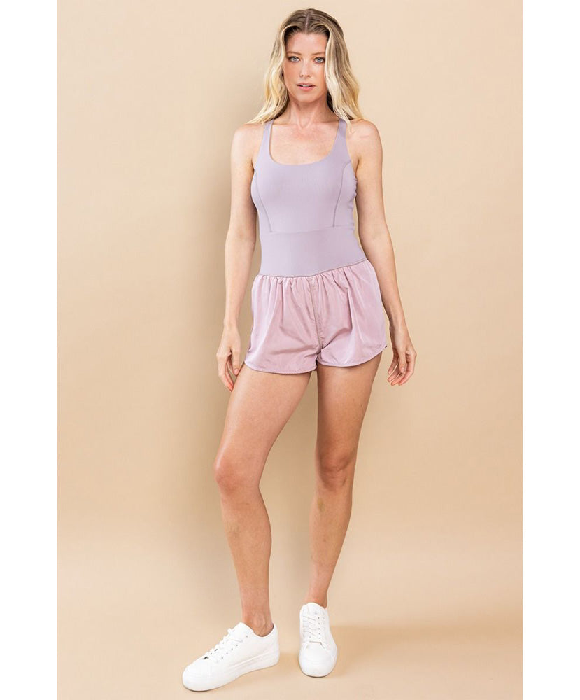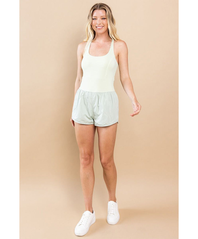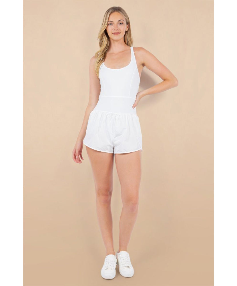 A sleeveless athletic romper, featuring a round neckline, and back pocket.