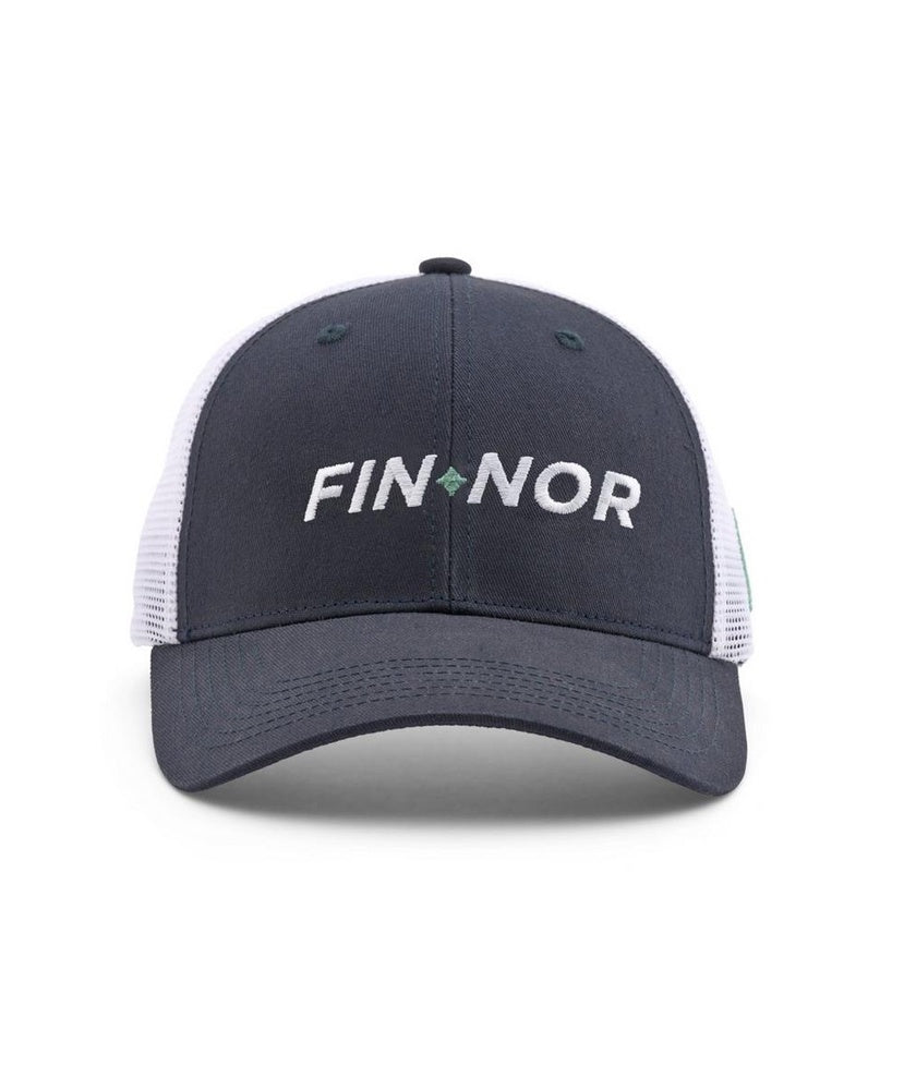 6-panel mid-profile structured trucker hat featuring embroidered FIN-NOR® logo with woven circular logo patch on side with embroidered border. Dark underbrim to reduce glare and a custom Fin-NOR® logo patch sewn in the cotton twill headband.