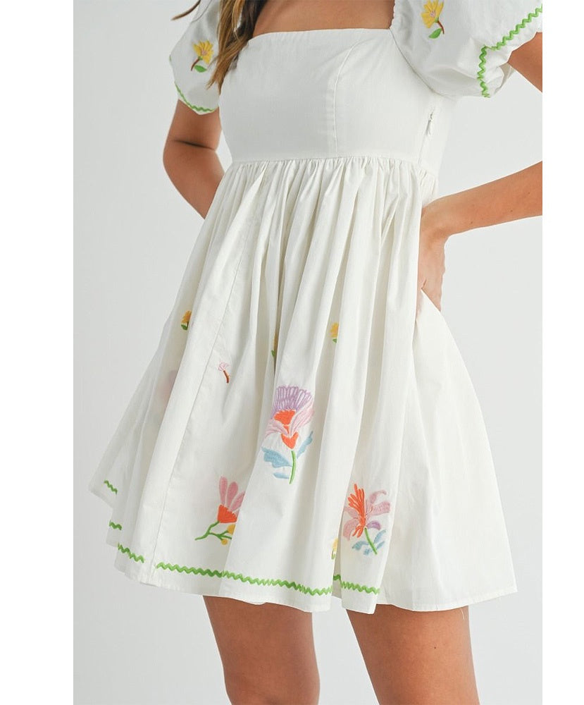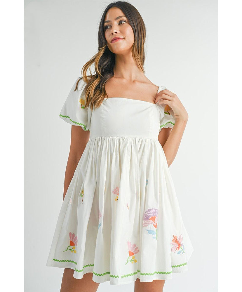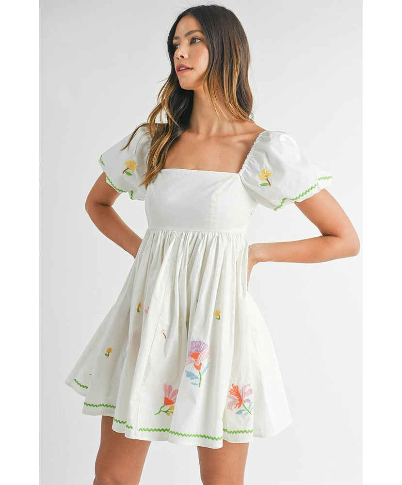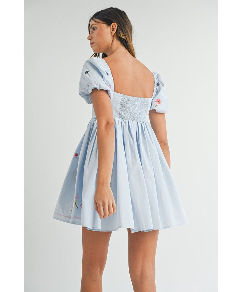Poplin with embroidered floral detail perfect babydoll mini dress with puff sleeve and smocked back detailing. Lining. Side invisible zipper.
