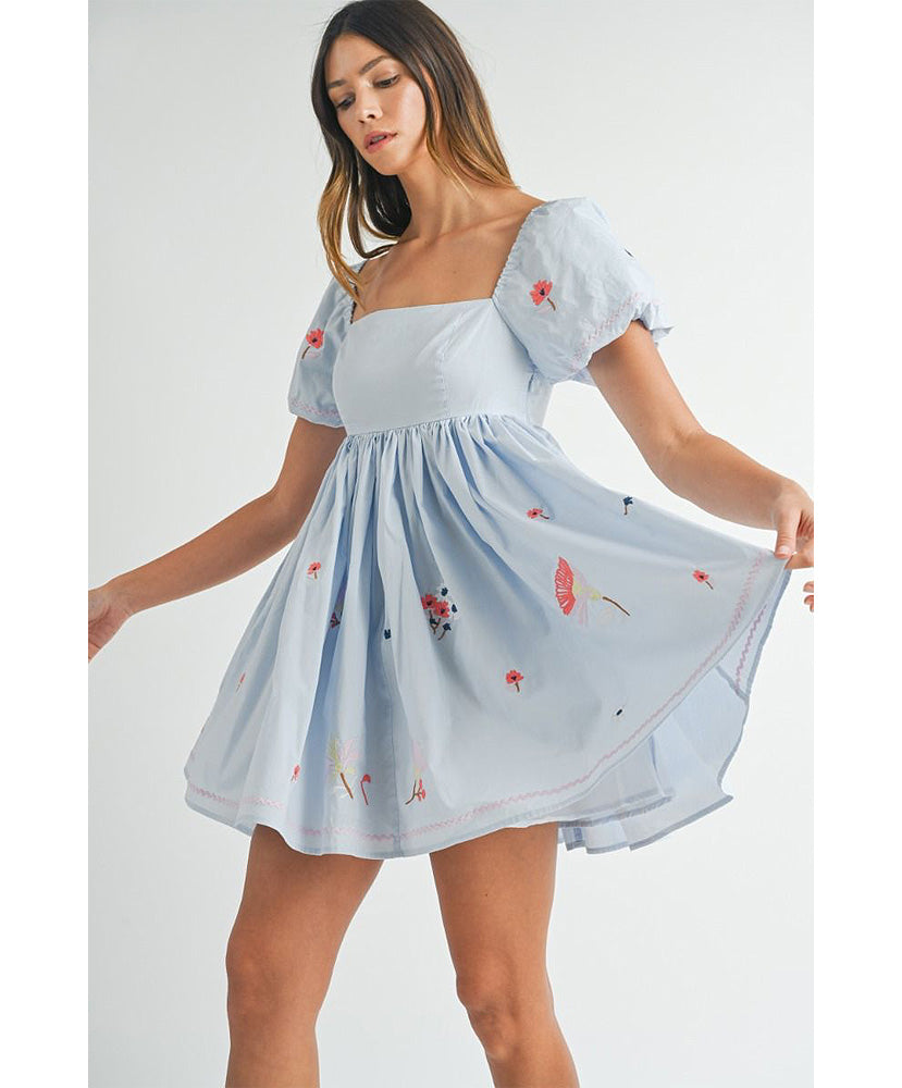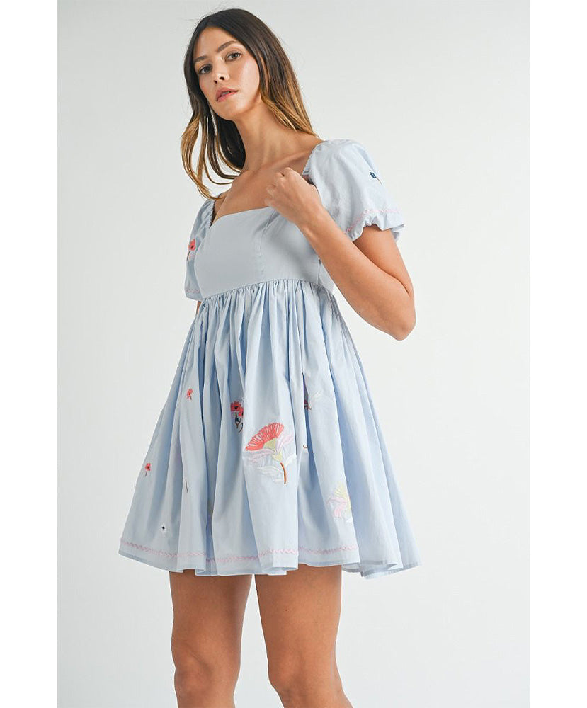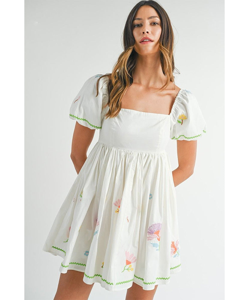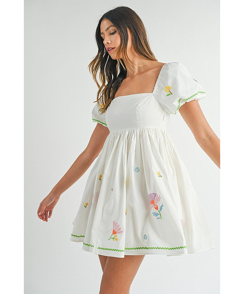 Poplin with embroidered floral detail perfect babydoll mini dress with puff sleeve and smocked back detailing. Lining. Side invisible zipper.