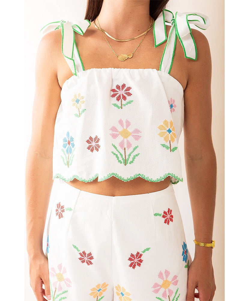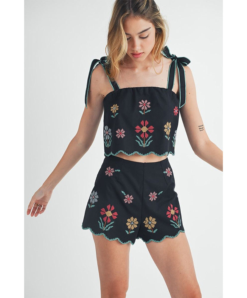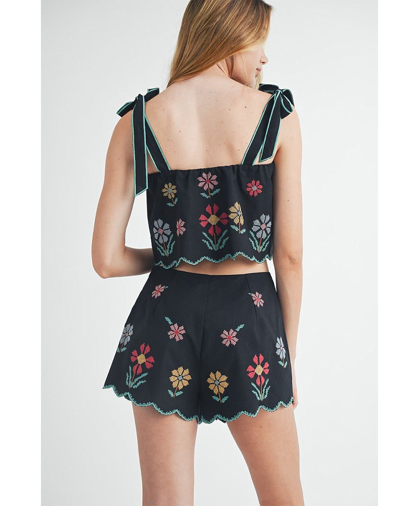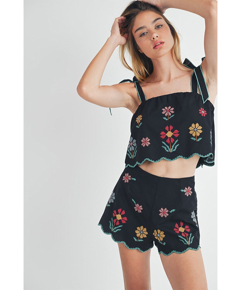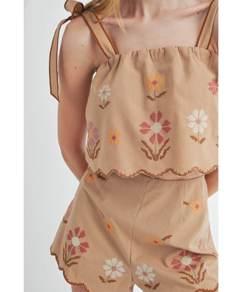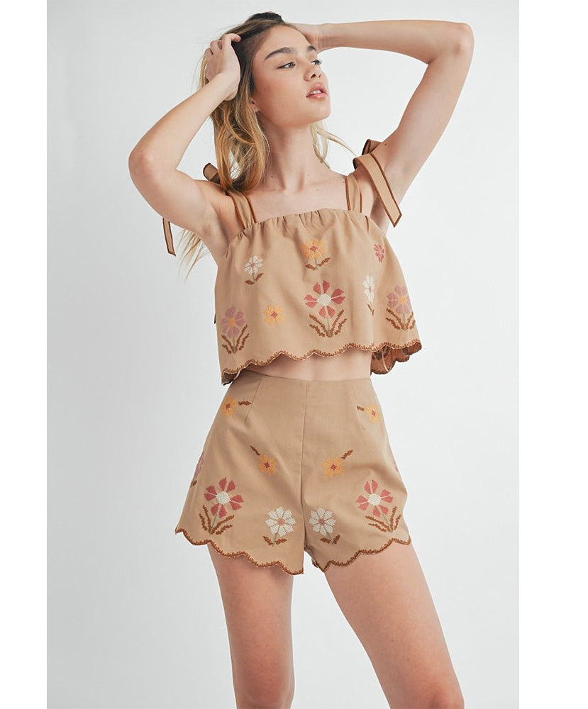 This set has been flying off te shelf! Perfect for Spring and Summer. Linen mix floral embroidered scallop crop top with self tie shoulder strap and matching scallop shorts set. Lining.