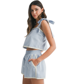 Whether you're lounging by the beach or strolling downtown, this set is serving easy charm with major style points. Featuring a lightweight crop top with self-tie shoulder straps and pintuck detail across the chest, this airy set is finished with contrast binding that makes it pop in all the right ways. The matching shorts keep it comfy with an elastic waistband and side pockets, all lined for a flattering fit. Throw on some sneakers or sandals and let the compliments roll in.