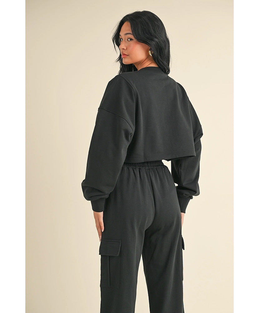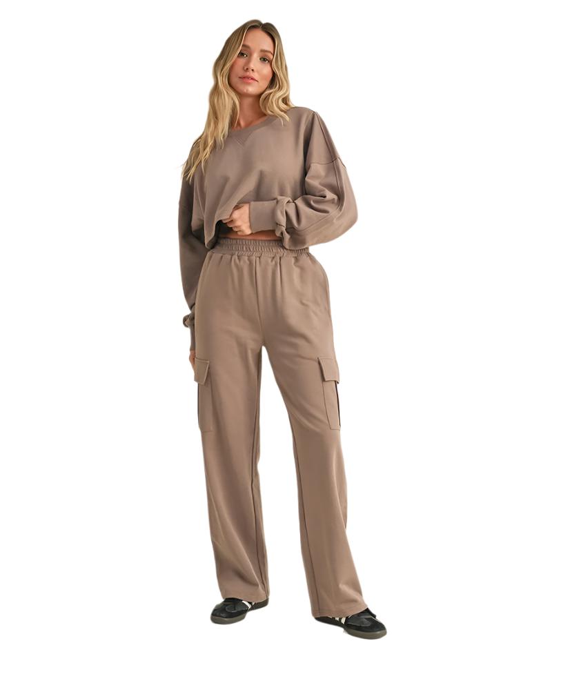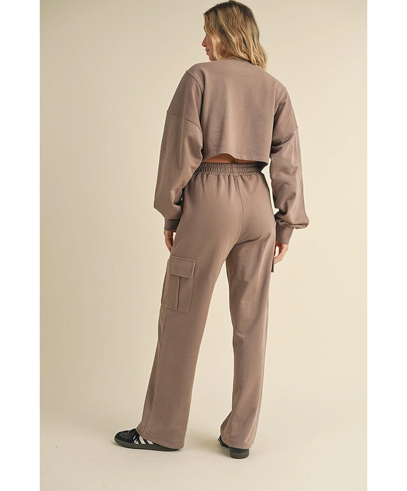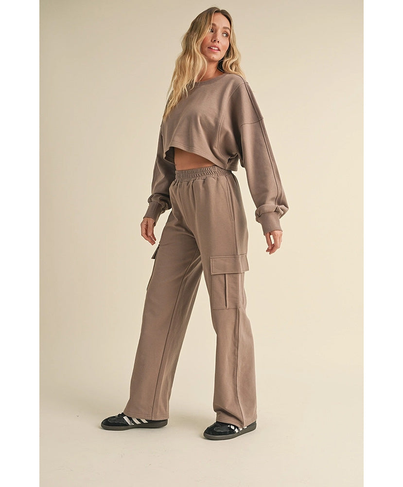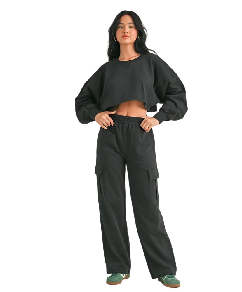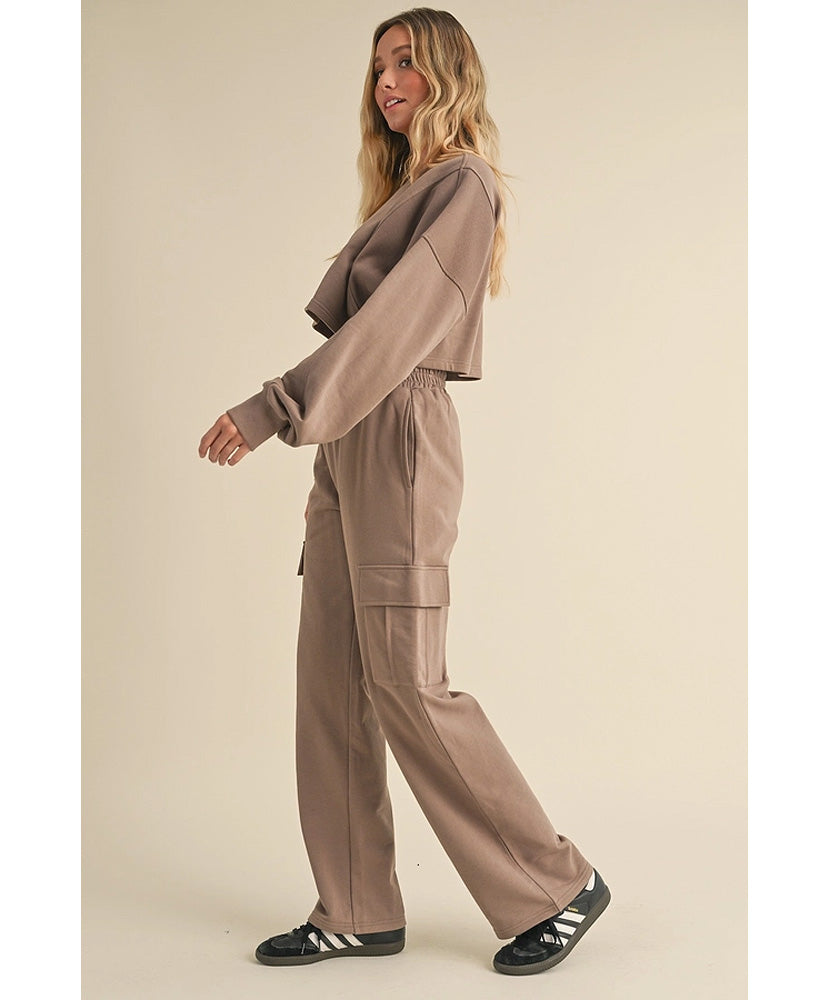 Flattering French terry set with an oversized crop sweatshirt and wide-leg cargo pants.