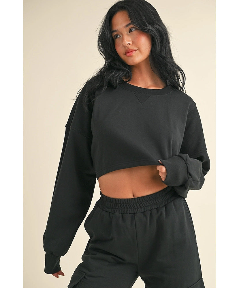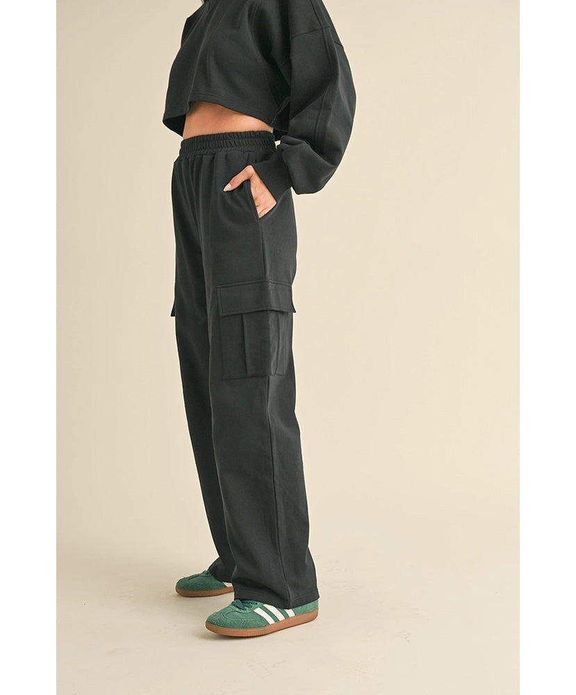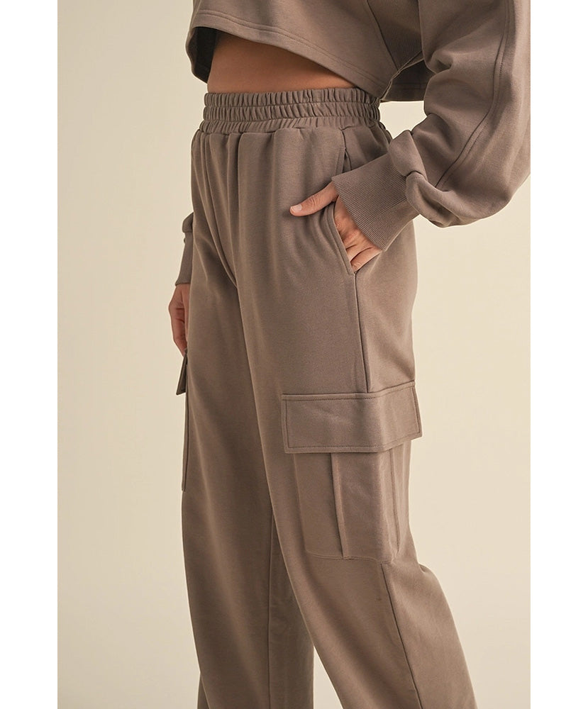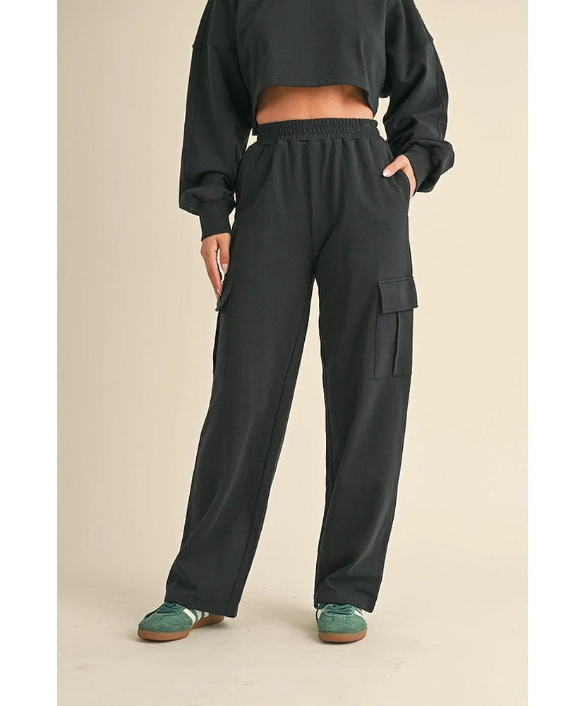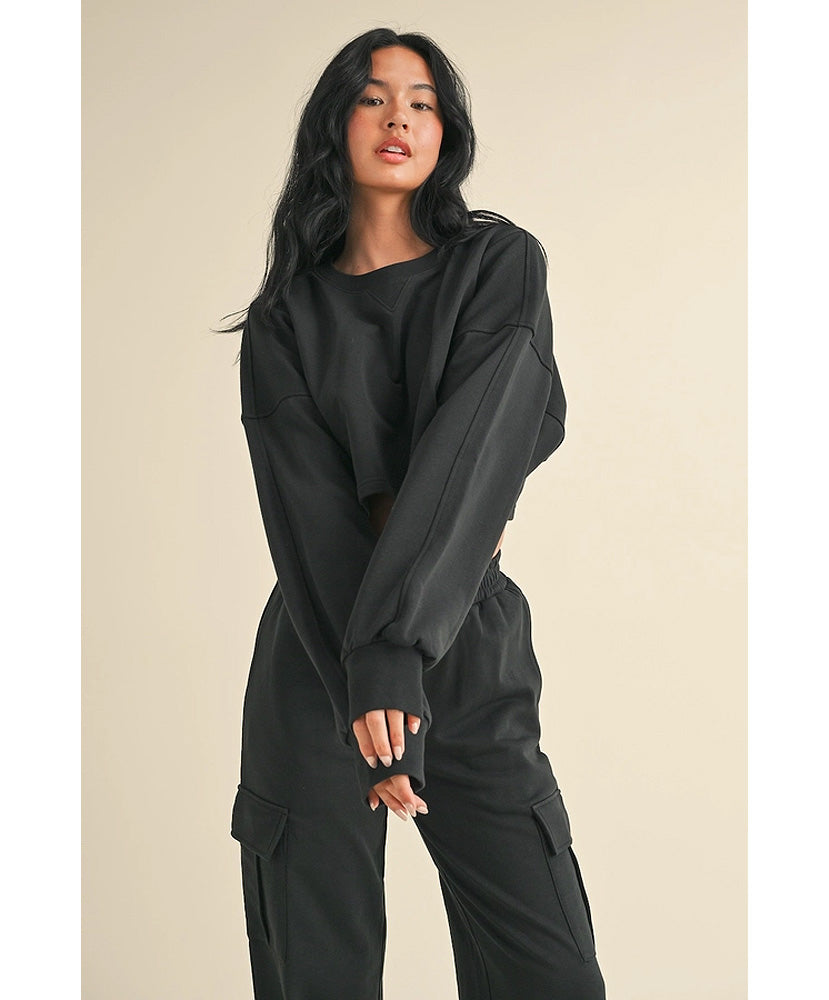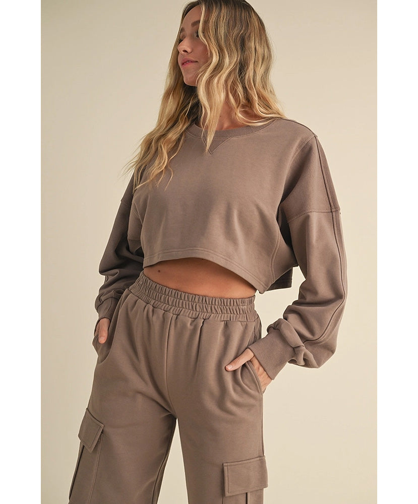 Flattering French terry set with an oversized crop sweatshirt and wide-leg cargo pants.