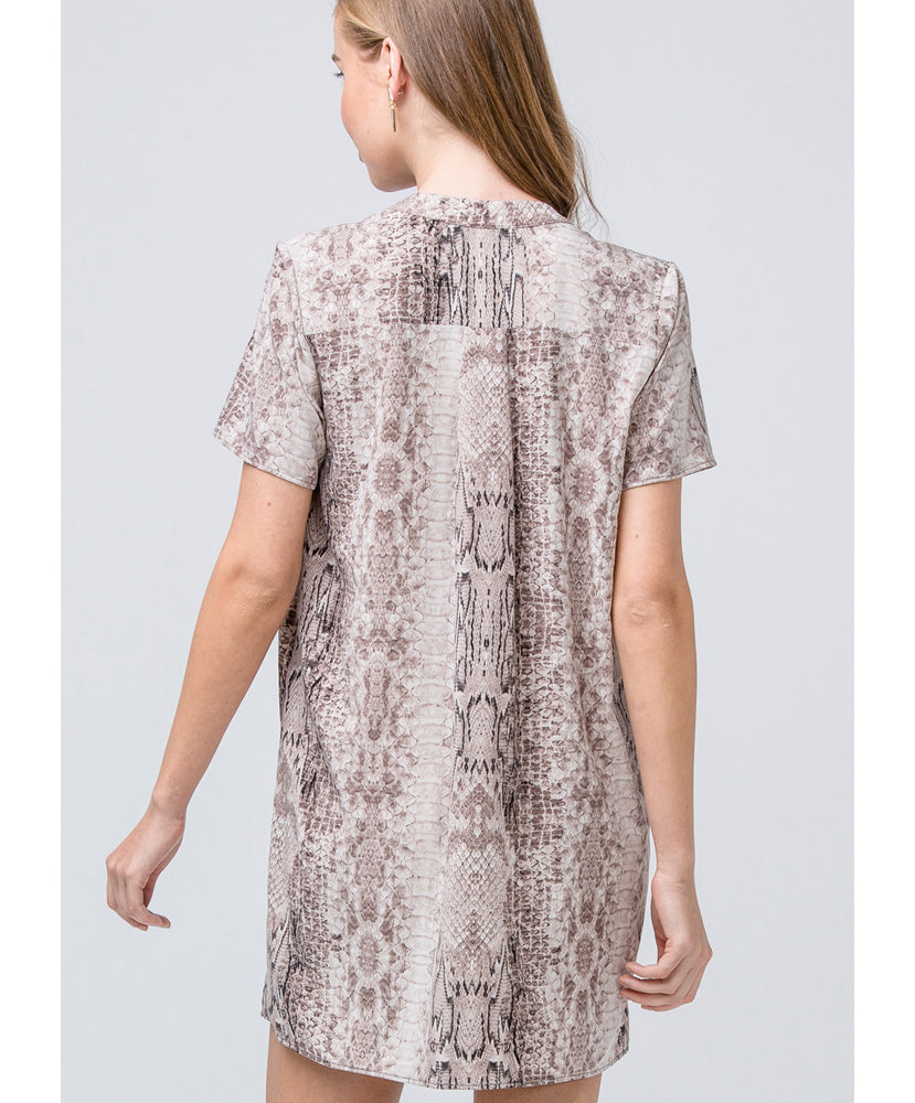 Reptile print shift dress featuring placket v-neckline detail. Unlined. Semi-sheer. Woven. Lightweight