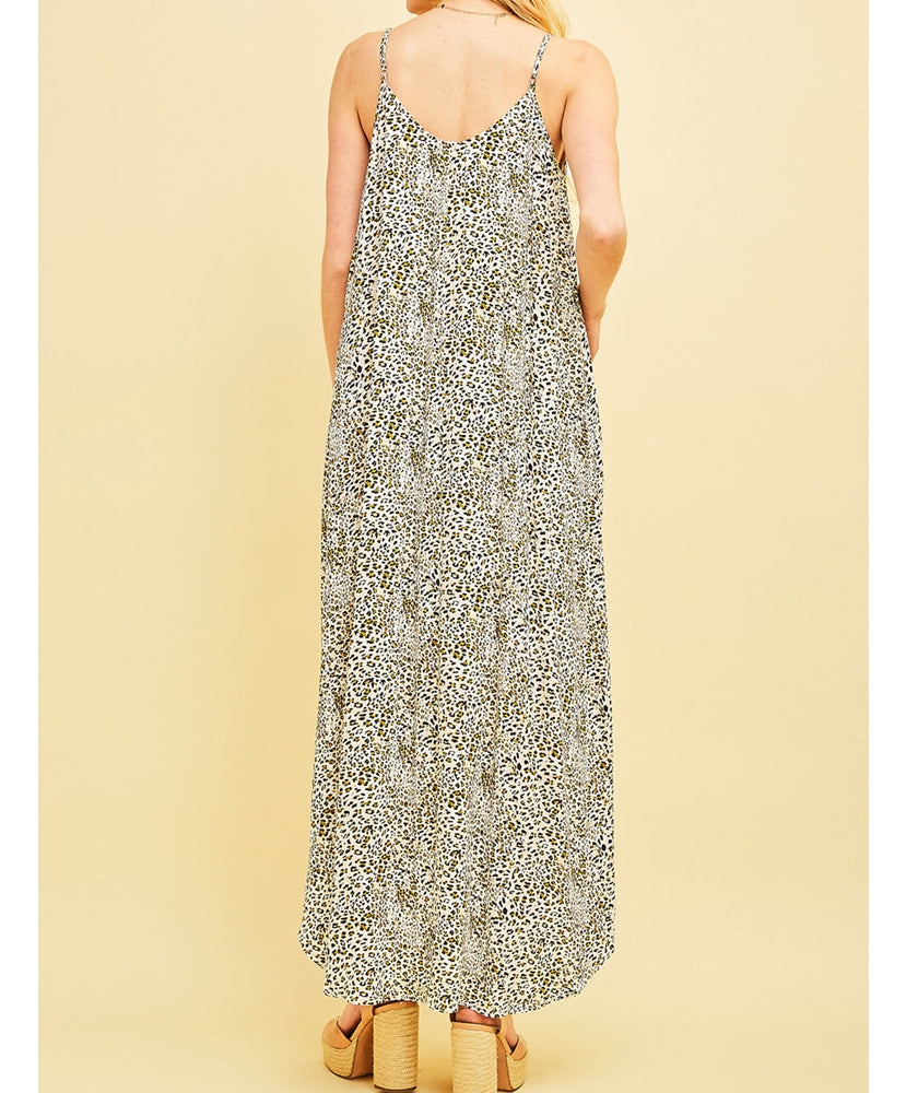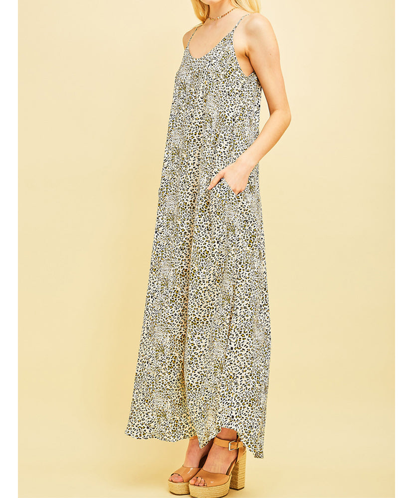 Cheetah print scoop-neck maxi dress featuring pocket detail at side. Adjustable straps. Lined. Non-sheer. Woven. Lightweight.