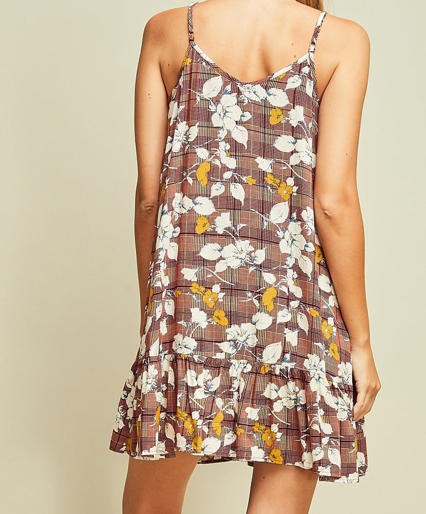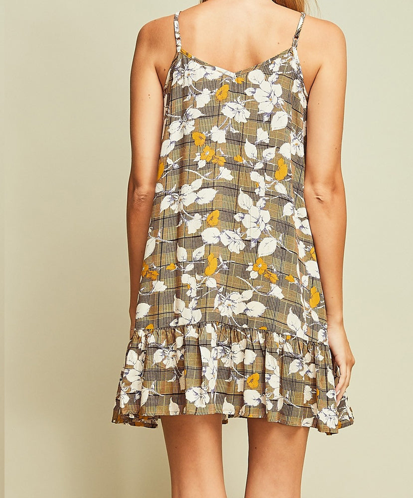 Floral and Plaid Print Spaghetti Strap Ruffle Dress