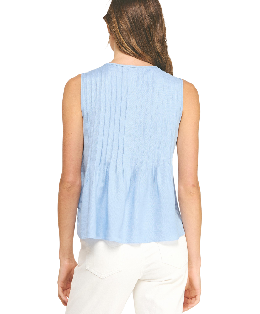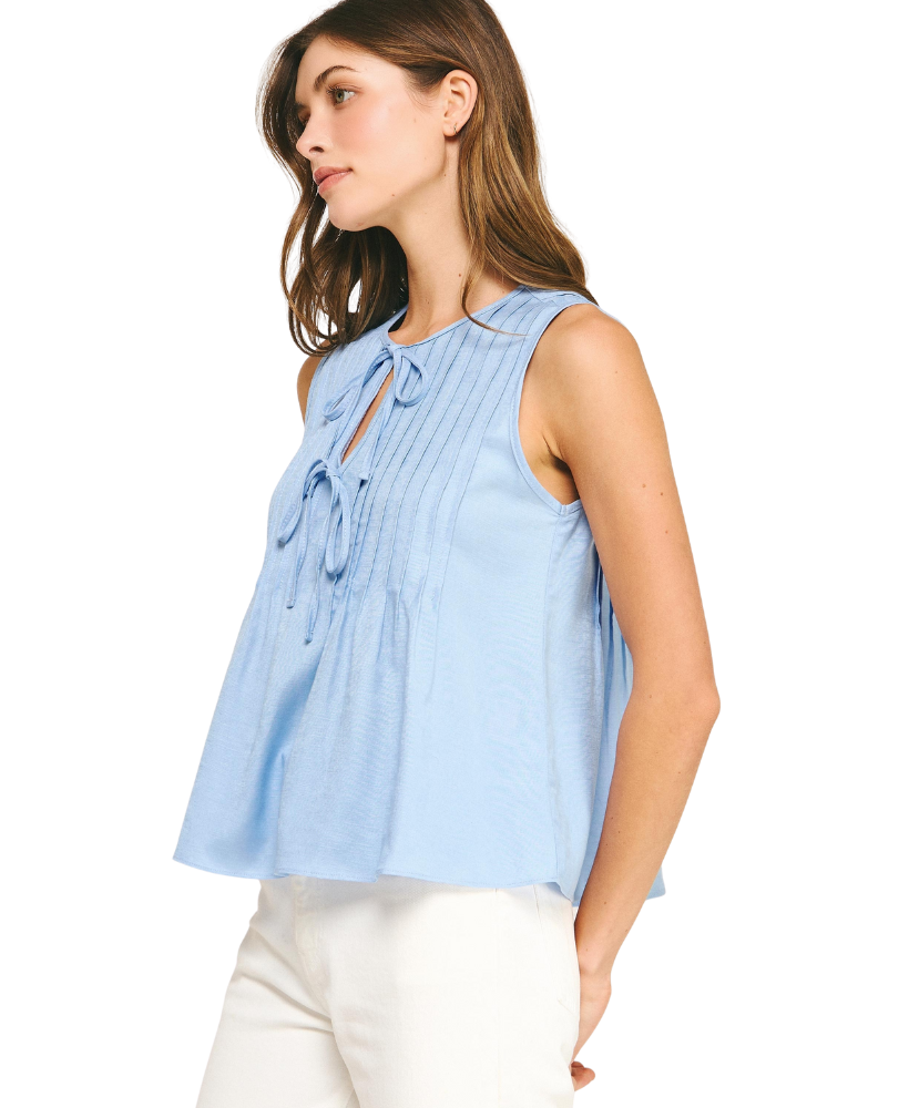 Breezy and effortlessly chic, the Maci Pintuck Linen Sleeveless Top is the ultimate warm-weather essential. With soft pin-tuck detailing and feminine tie accents, it adds a subtle touch of sophistication to any look.