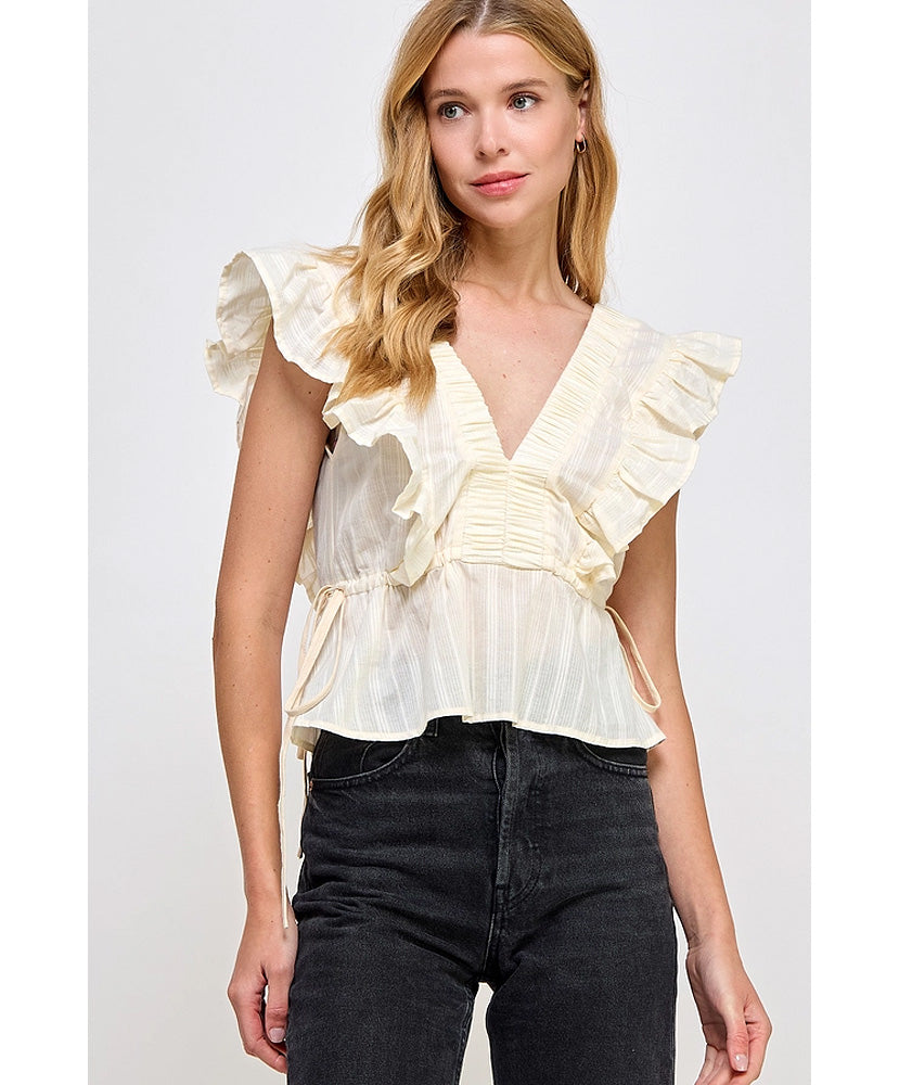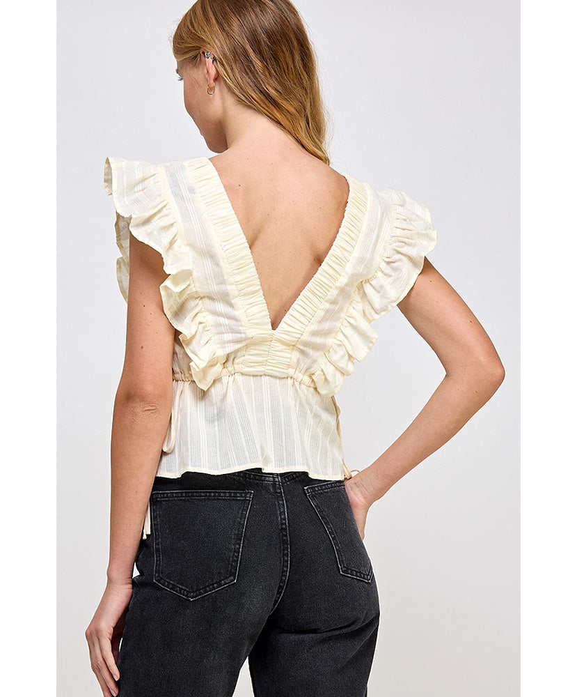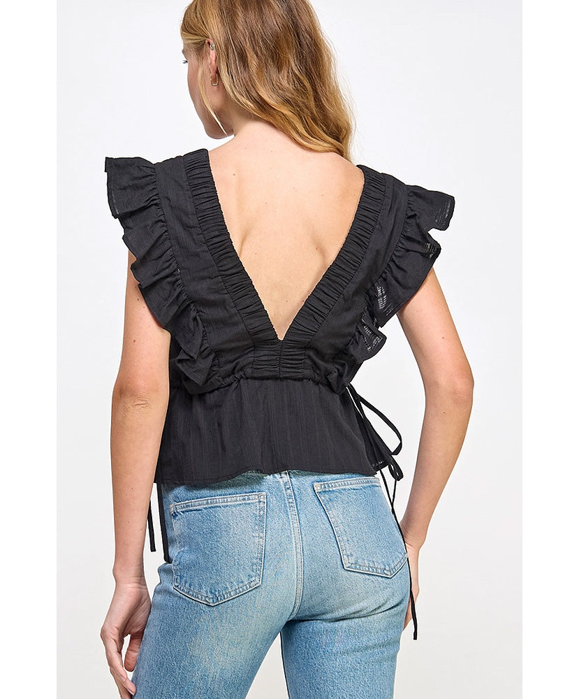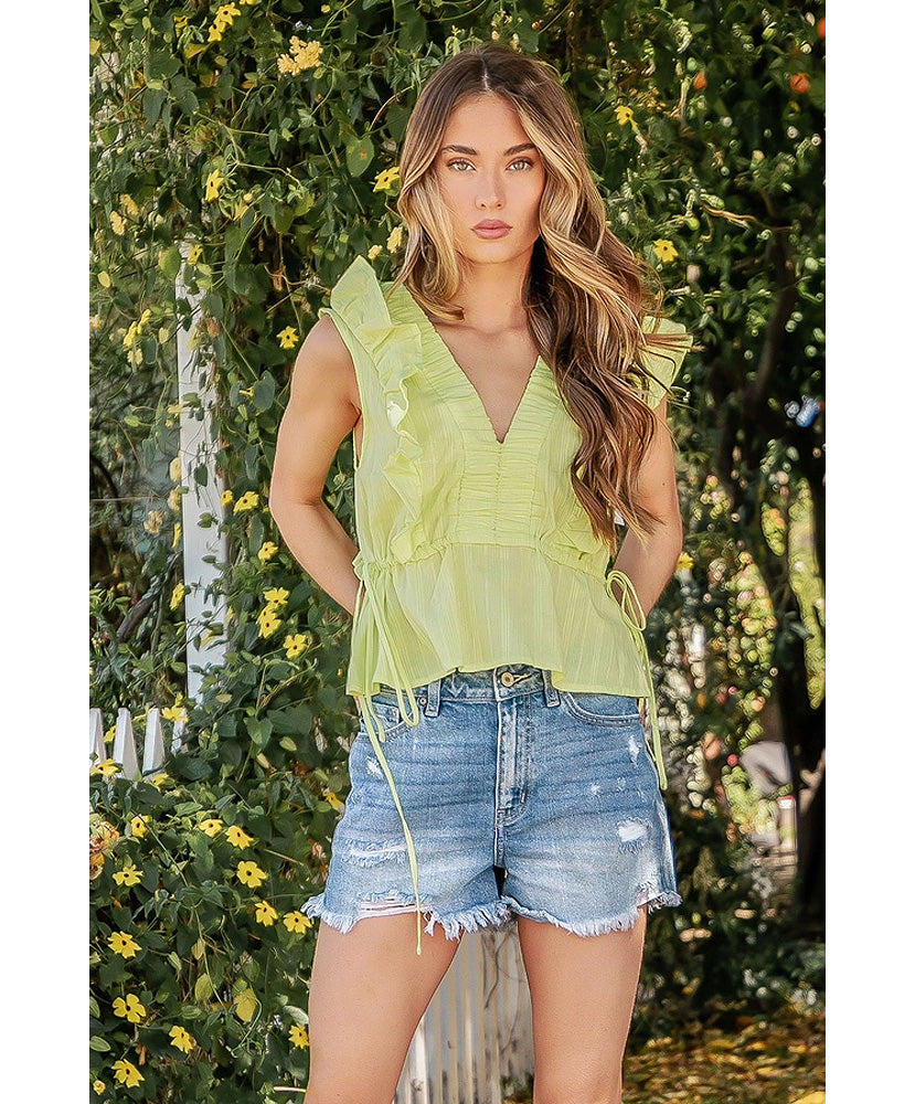 Smocked detail ruffle top in textured striped cotton voile fabric. This ruffles frill sleeveless style features a classic front/back V neck, smocking detail at front/back, and adjustable drawstring bow tie at the waist for flattering.