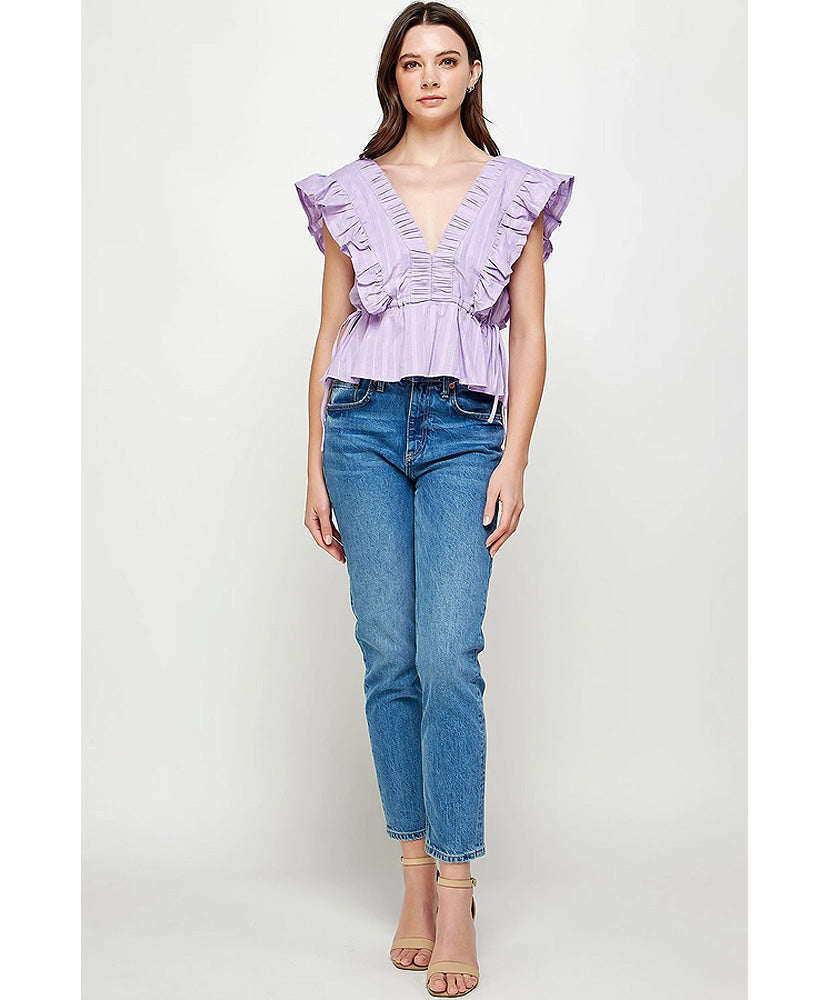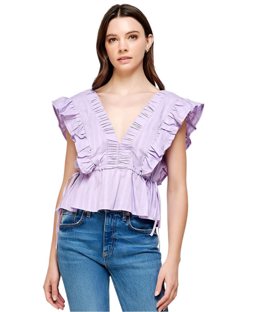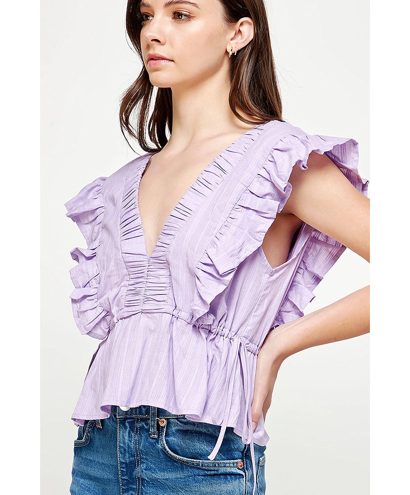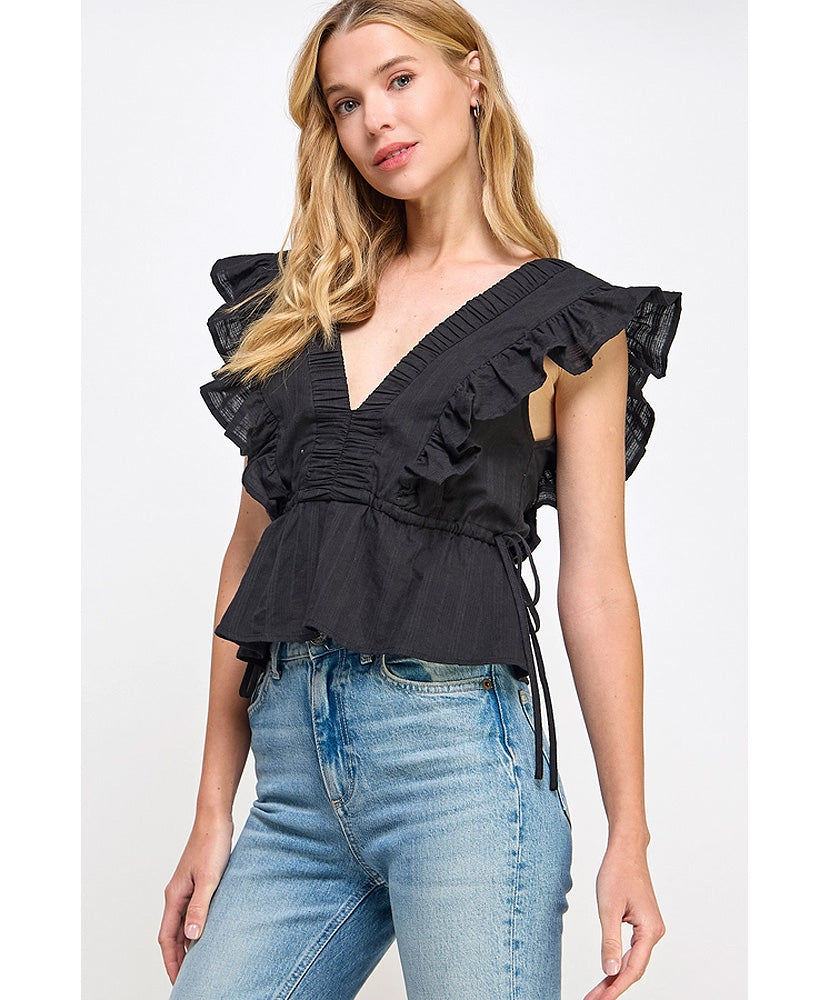 Smocked detail ruffle top in textured striped cotton voile fabric. This ruffles frill sleeveless style features a classic front/back V neck, smocking detail at front/back, and adjustable drawstring bow tie at the waist for flattering.