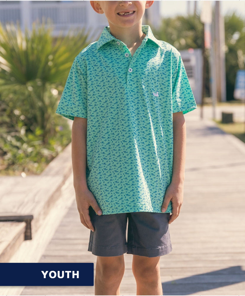 Designed for all day adventures, the Youth Offshore Flyline Performance Polo is crafted with breathable poly-elastane fabric and 4-way flexibility and a custom micro print patterned design.
