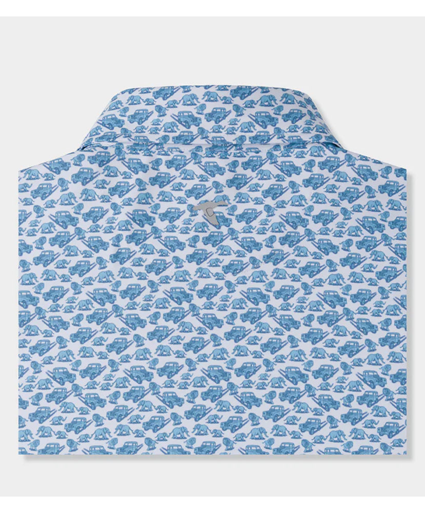 Hit the open road in this performance polo, which relies on brrrº cooling technology that is moisture wicking and fast drying. Inspired by the collection of one of Genteal's founders, this unique pattern features a vehicle that is fit to go off-road to a camp site or between the lines to a weekend getaway. it features a heat transfer logo on the center back neck polo, as well as sewn-in permanent collar stays.