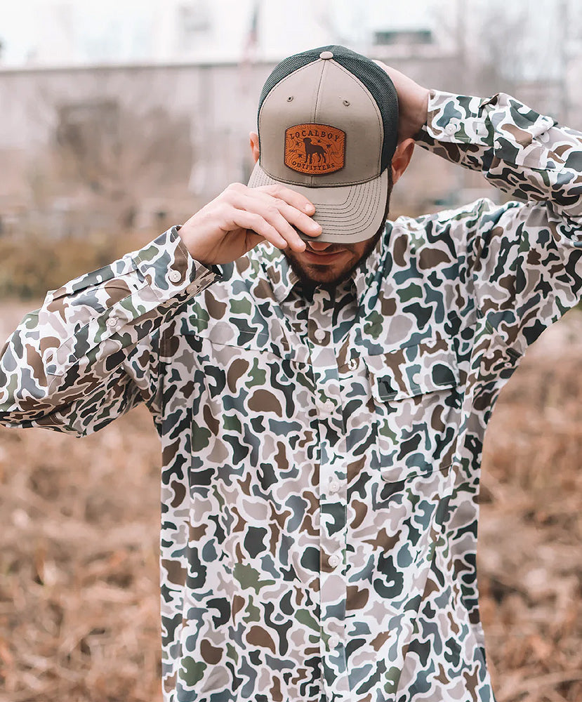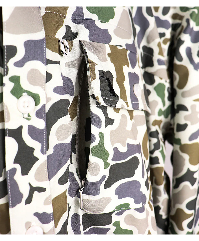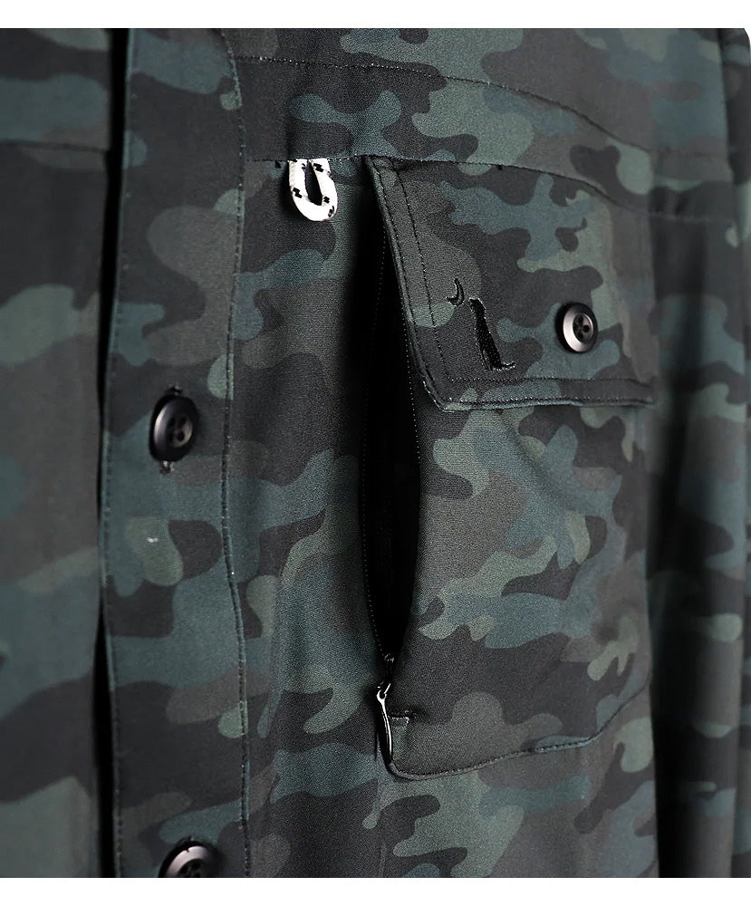 Our seadations are great for a day on the boat or hunting. They have buttons located near the elbows so the sleeves can be rolled up. It also features a pocket on the left chest embroidered with the dog & moon logo.