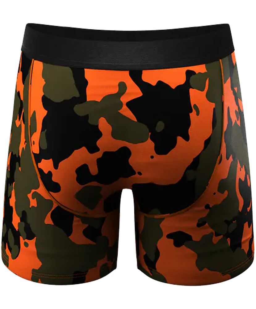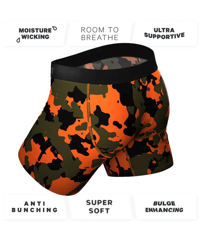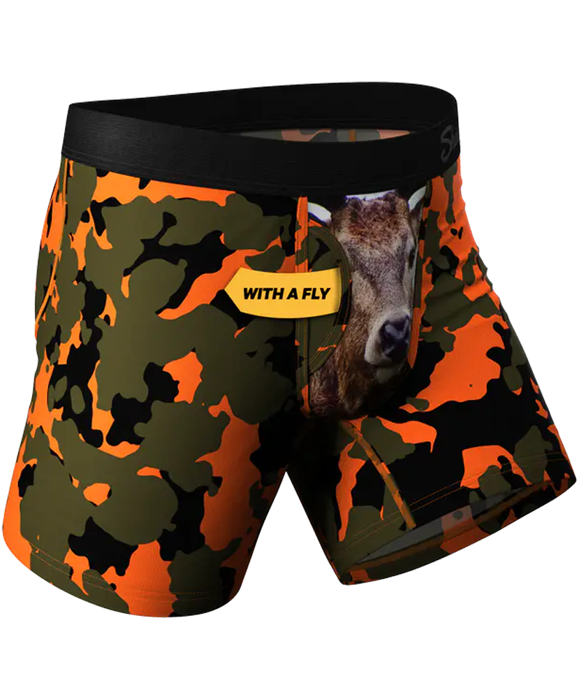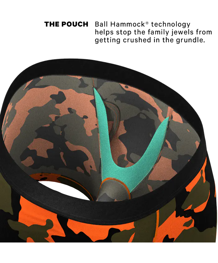 The time I appreciate the Bambi Bunchers (see camo Ball Hammock) the most is after a long, arduous day of crouching around in the woods waiting for my ideal bucky. After taking an all-black Ford Raptor back to my log cabin party pad, I crank some Bob Seger while slowly stripping out of my full-flex ghillie suit, simultaneously powering through 6-10 extra-salty venison sticks to re-power my body and keep me focused. Keep the Bojangles bouncing even during your sweatiest forest sessions with these orange camo deer boxers.