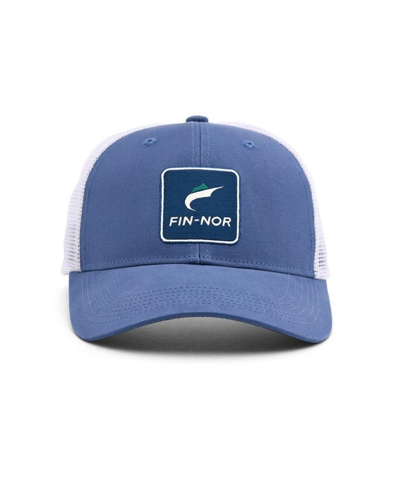 6-panel mid-profile structured trucker hat featuring square woven FIN-NOR® logo patch with embroidered border. Dark underbrim to reduce glare and a custom Fin-NOR® logo patch sewn in the cotton twill headband.