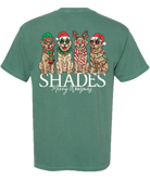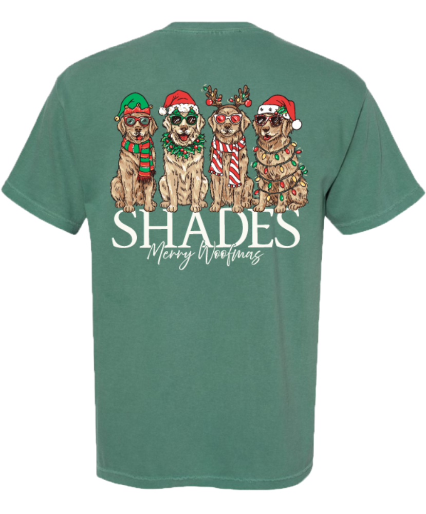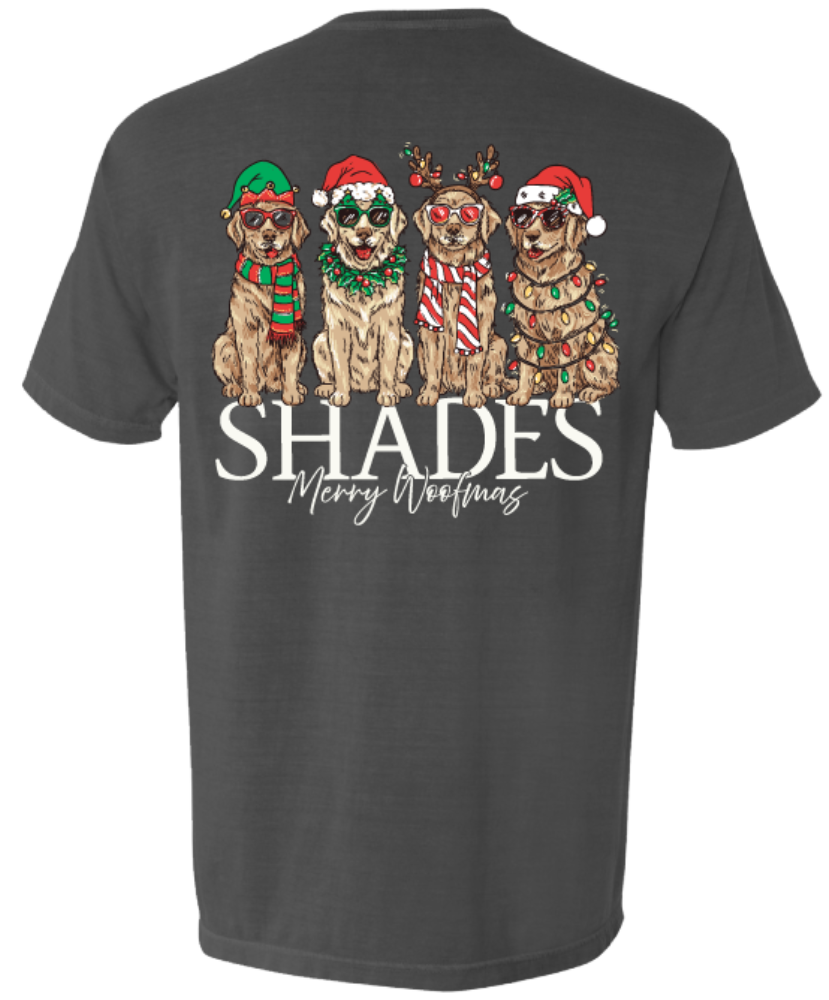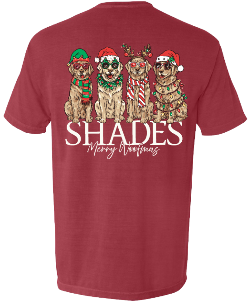 The holiday favorite is back! Our Merry Woofmas Tee features the Shades golden retrievers dressed in their Christmas best—ready to spread cheer, wagging tails, and a little mischief. Printed on the back of a soft Comfort Colors pocket tee, this festive favorite is perfect for cozy nights, holiday parties, or just showing off your love for man’s best friend.