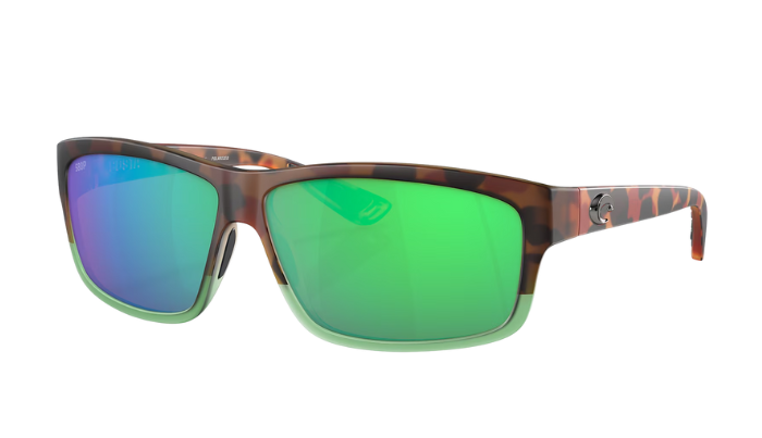 Costa Sunglasses with tortoise frame and green lenses on a white background