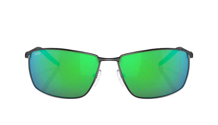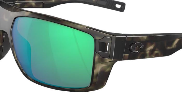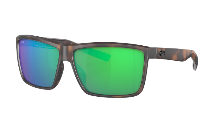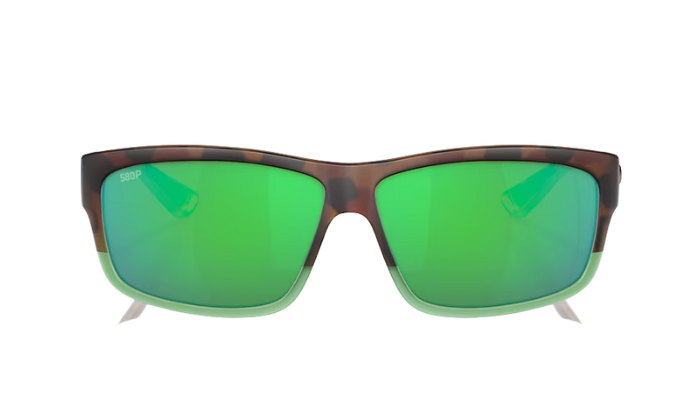 Rimless Costa Sunglasses with green mirror lenses and tortoise shell frames on a white background