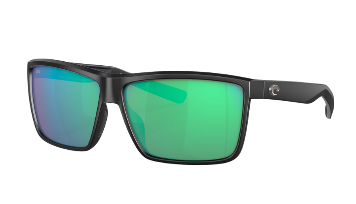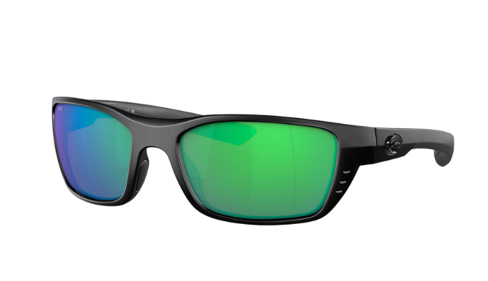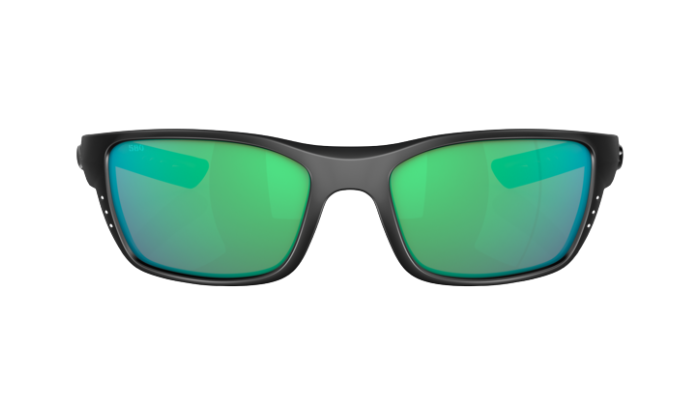 Black Costa sunglasses with green lenses on a white background