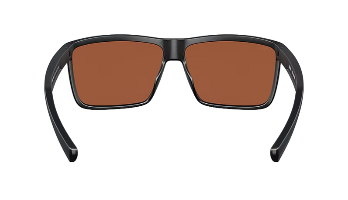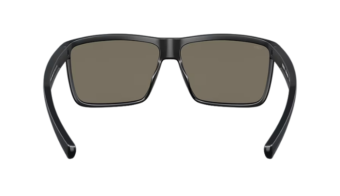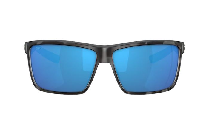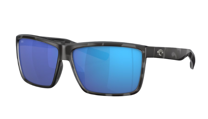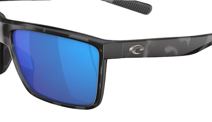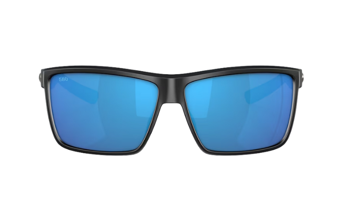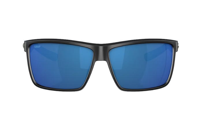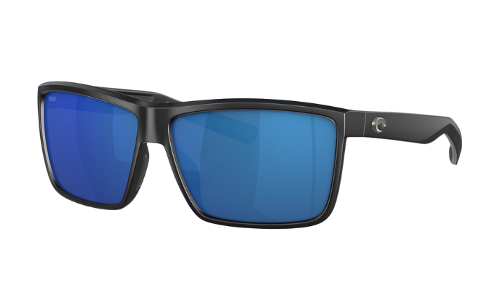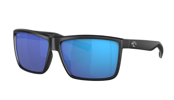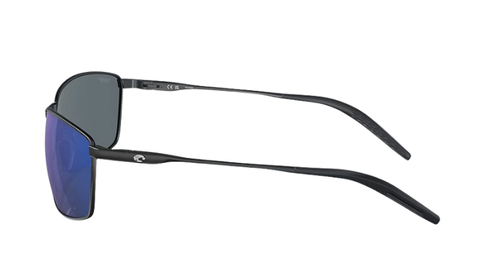 Rimless Costa Sunglasses with blue lenses and black frames on a white background