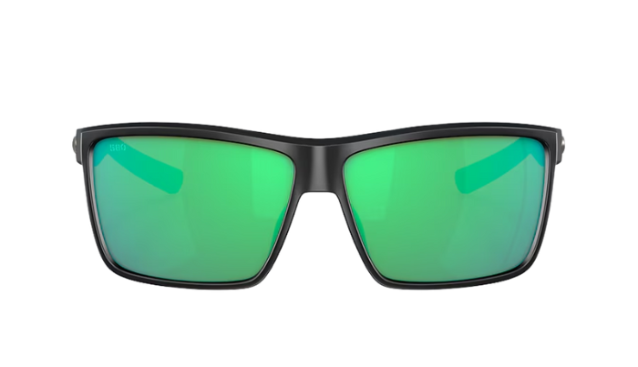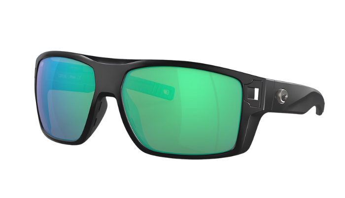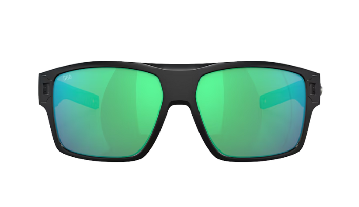 Costa Black sunglasses with green and blue lenses on a white background