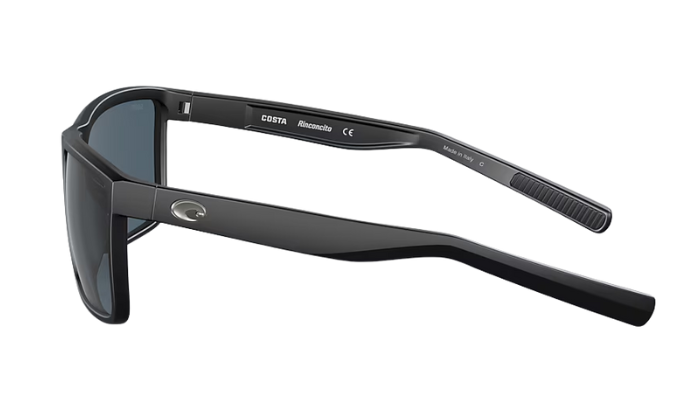 Black Costa wraparound sunglasses with gray lenses and a visible Costa brand logo on a white background