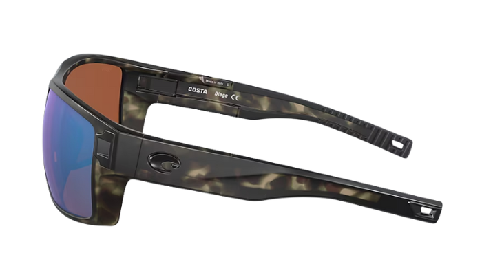 Tortoise shell Costa sunglasses with green mirror lenses on a white background