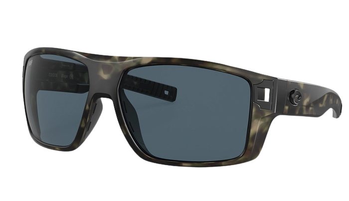 Camoflage Costa sunglasses with gray lenses on a white background
