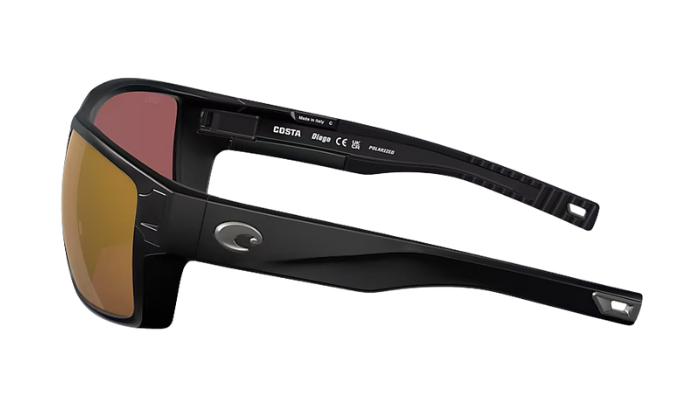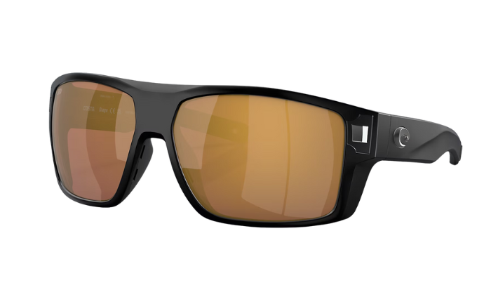 Black Costa wraparound sunglasses with a Costa brand logo on a white background
