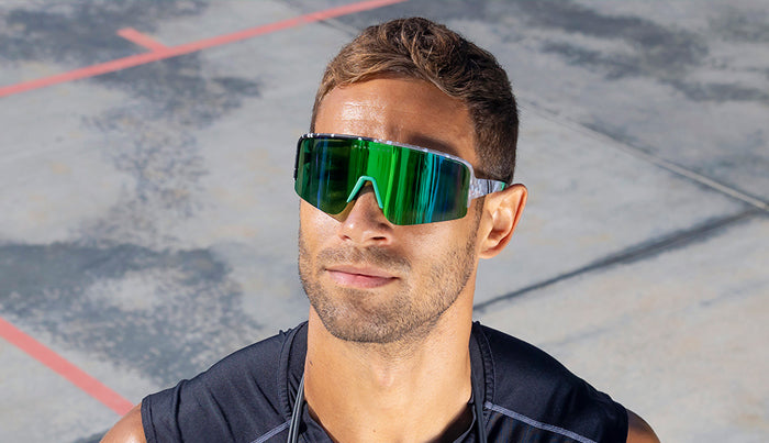 Caution is cast to the wind here—these single lens sunglasses are full speed ahead. The incredible wraparound TR90 construction is lightweight and comfortable thanks to a semi-rimless design that makes getting in motion easier than ever. Unisex frame. 100% UV protection.