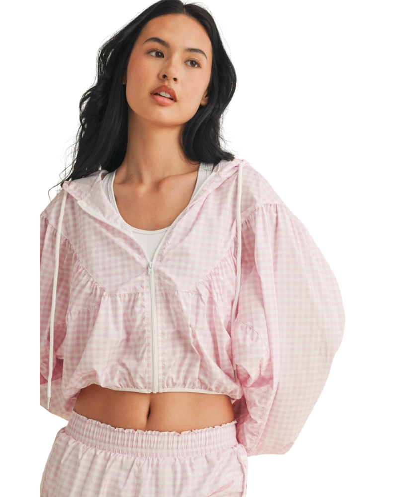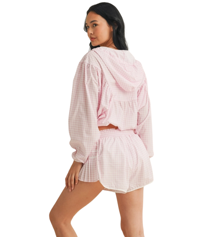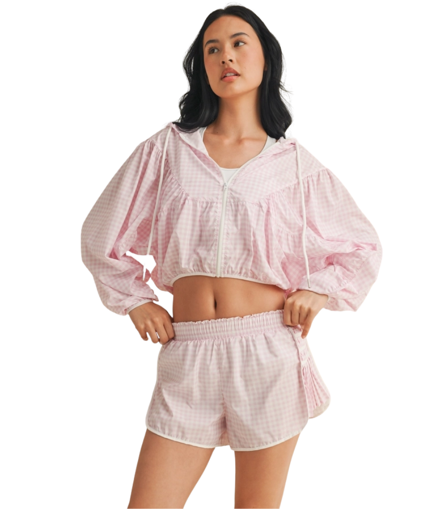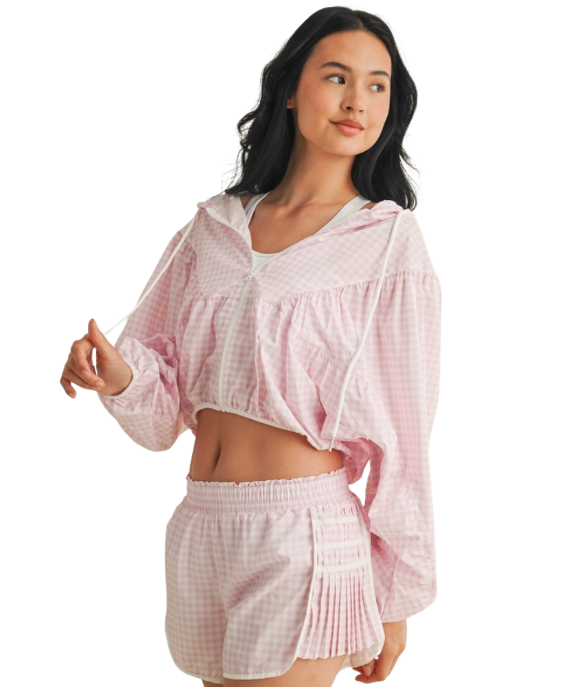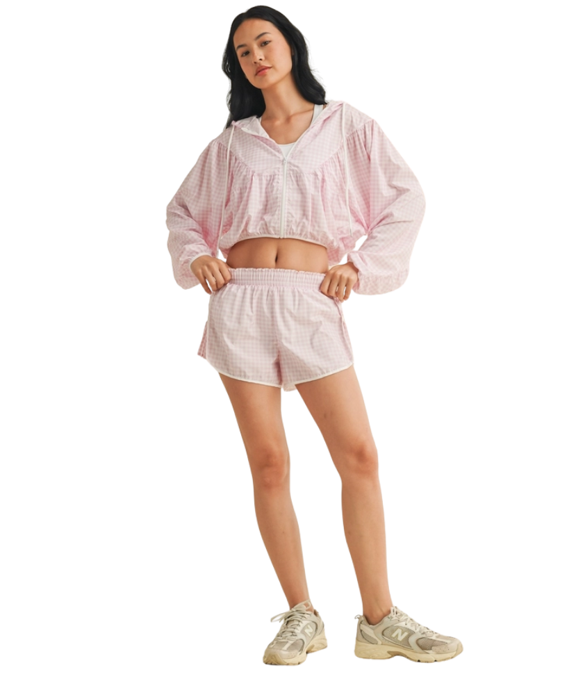 Ready when you are—the Gingham Go-Time Lightweight Jacket is your new favorite grab-and-go layer. Made with breezy, breathable fabric and a charming pink gingham print, this windbreaker keeps things cool and cute whether you're heading to the gym, running errands, or lounging in style. Designed with a full zip front, roomy sleeves, and an adjustable drawstring hood for that perfect fit. Even better? It pairs perfectly with our Gingham Go-Time Shorts for a matching moment.